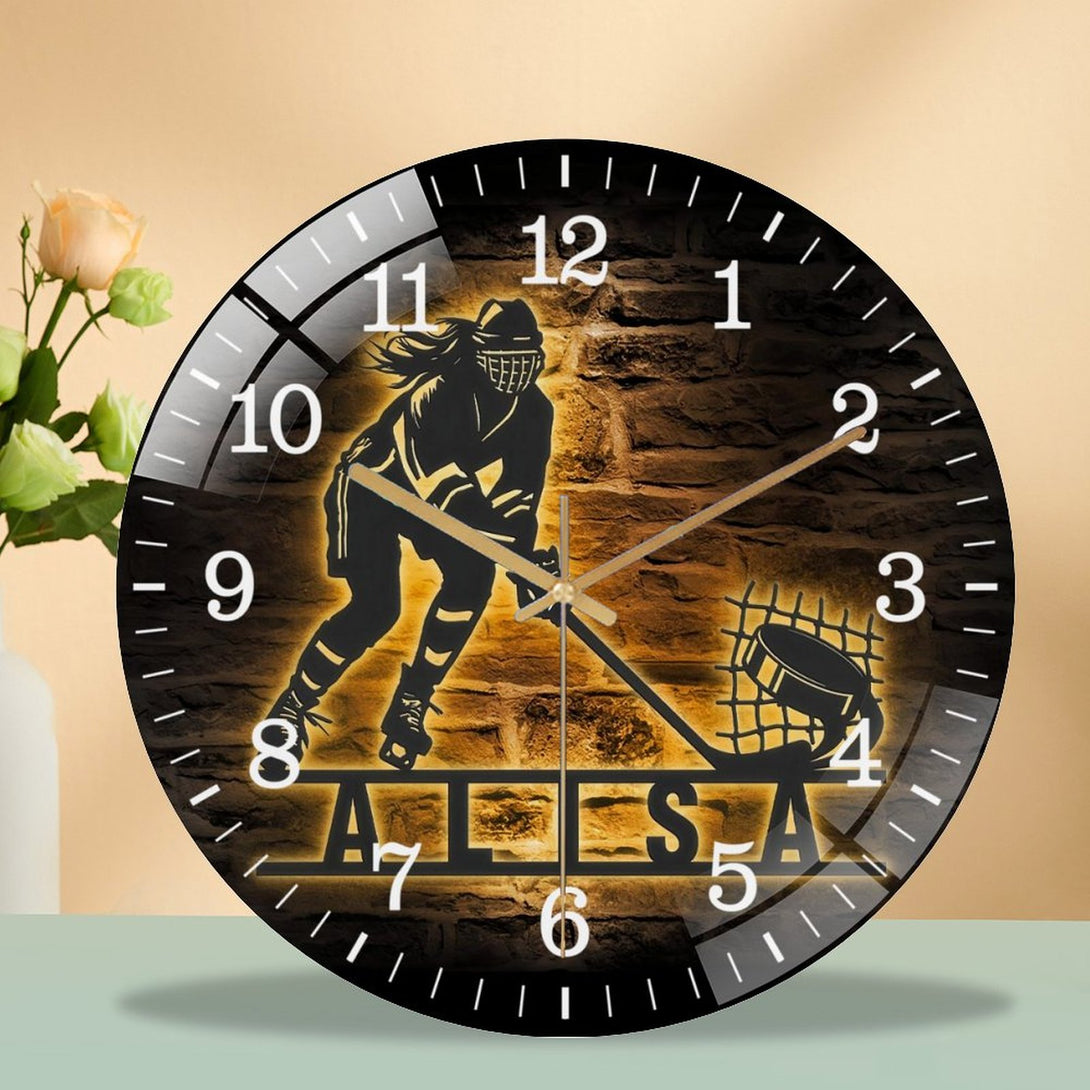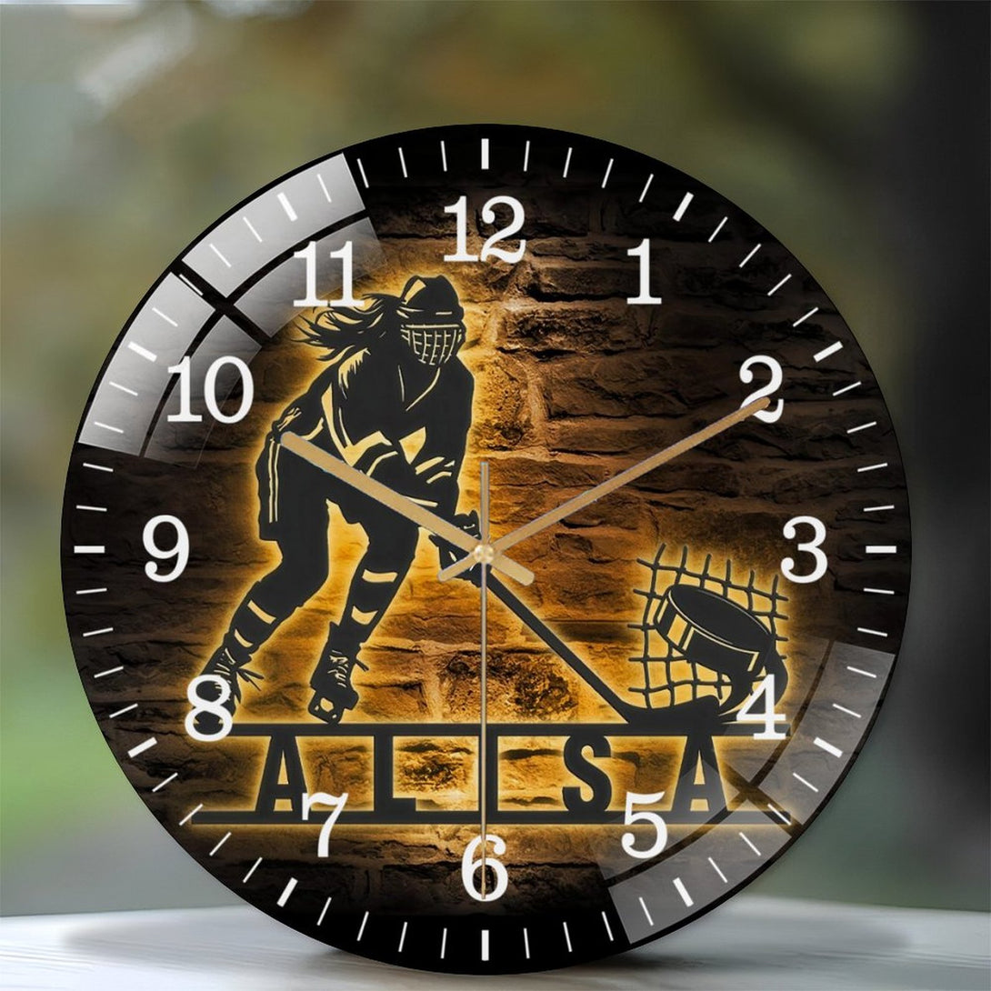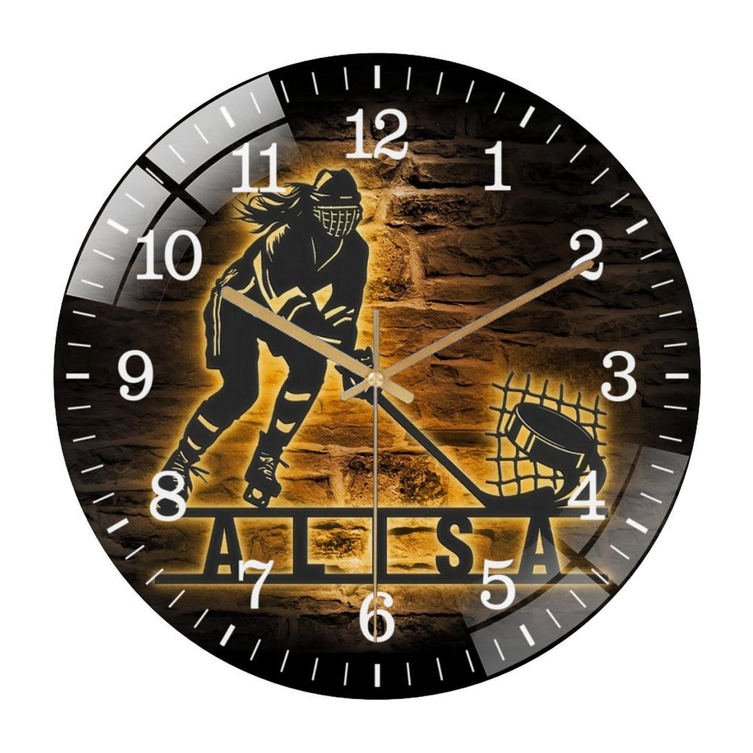 Woman Ice Hockey Player Glass Wall Clock, Female Hockey Wall Clock , Home Decor Kid Nursery Decoration Christmas,12×12inch(30×30cm)