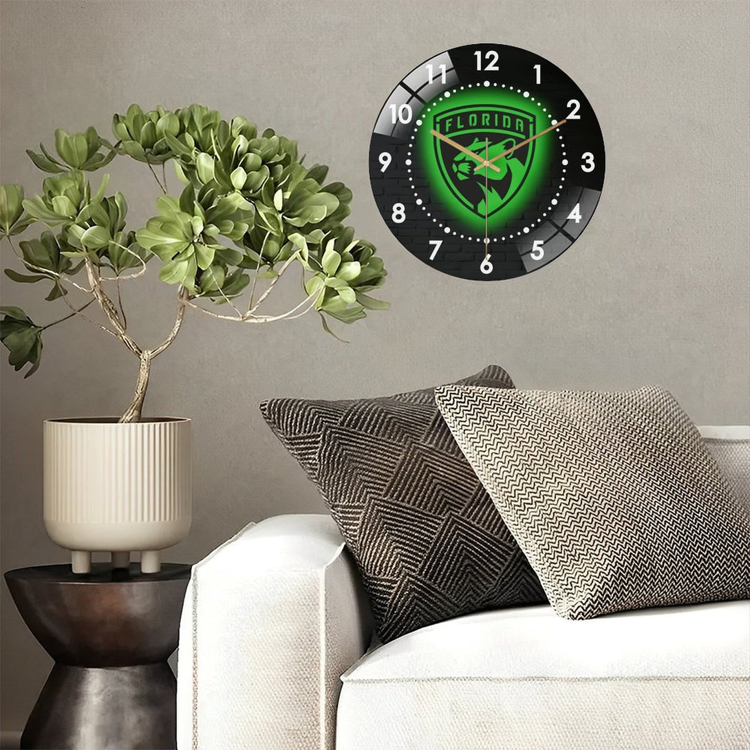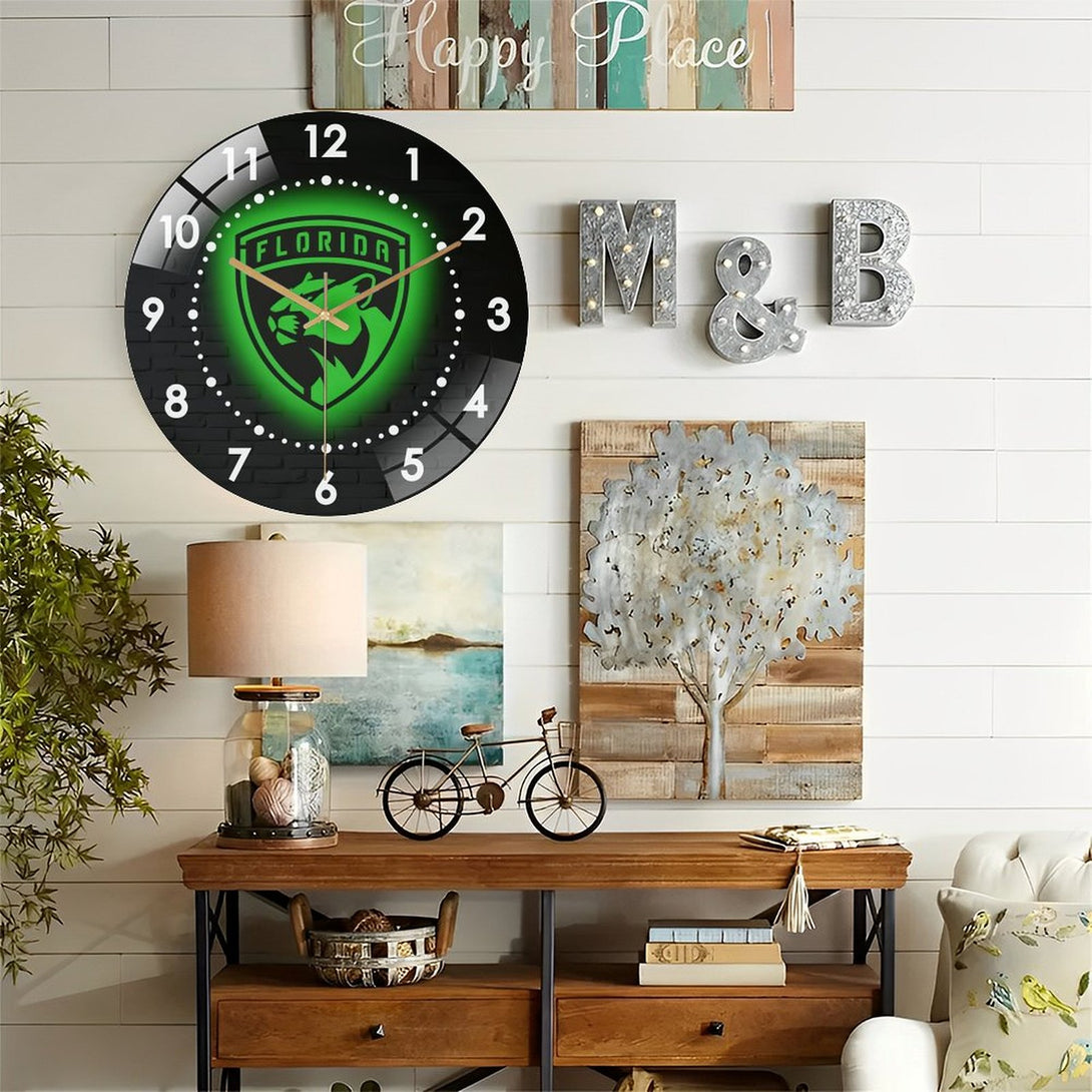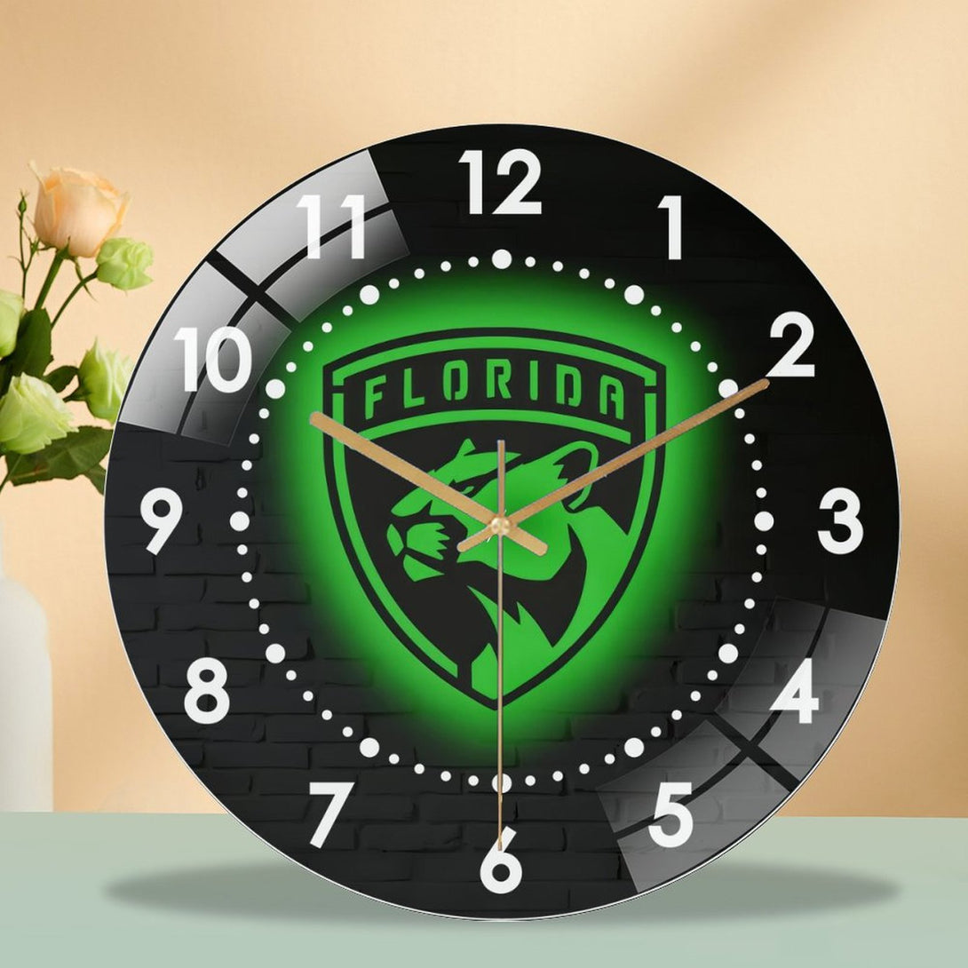 Decorative Clocks: Florida- Panthers Glass Wall Clockr – Modern N H L Team Wall Art Glass Wall Clock, Hockey Fan Gift, Game Room Or Sports Bar Metal Wall Accent Style 12×12inch(30×30cm)