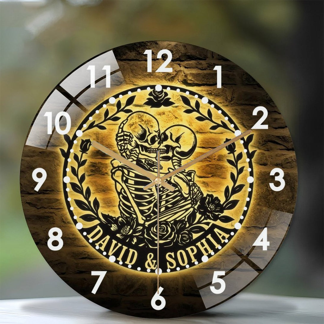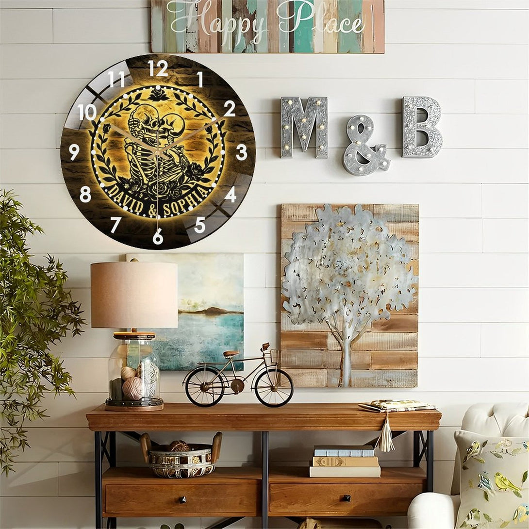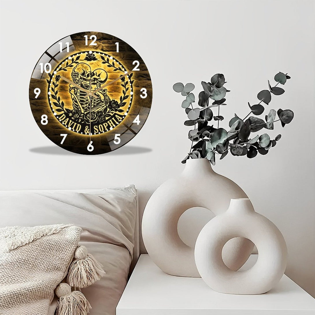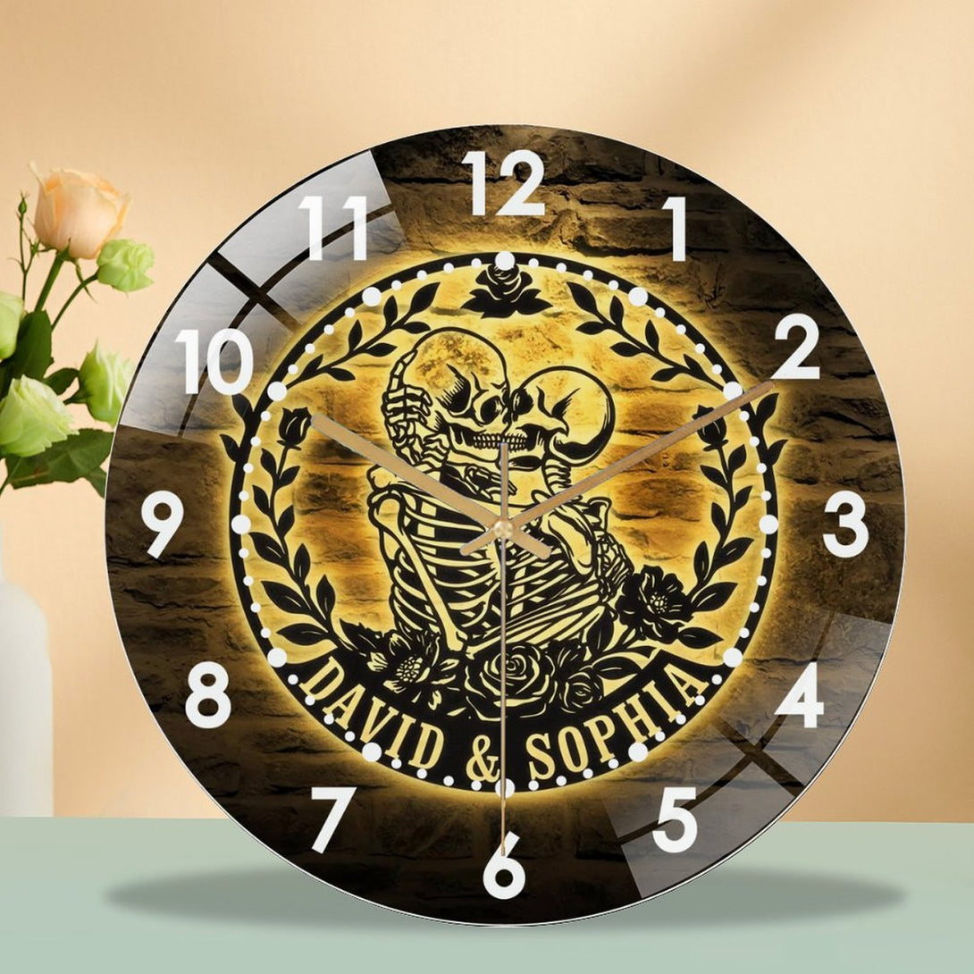 Decorative Clocks: Skeleton Couple Kissing with Roses Glass Wall Clock– Skeleton Couple Wall Clock for Home Decor Wedding Gift Decor. Hallo-ween Valentine Gift, Skull Lover Gift, Gothic Home Decor,