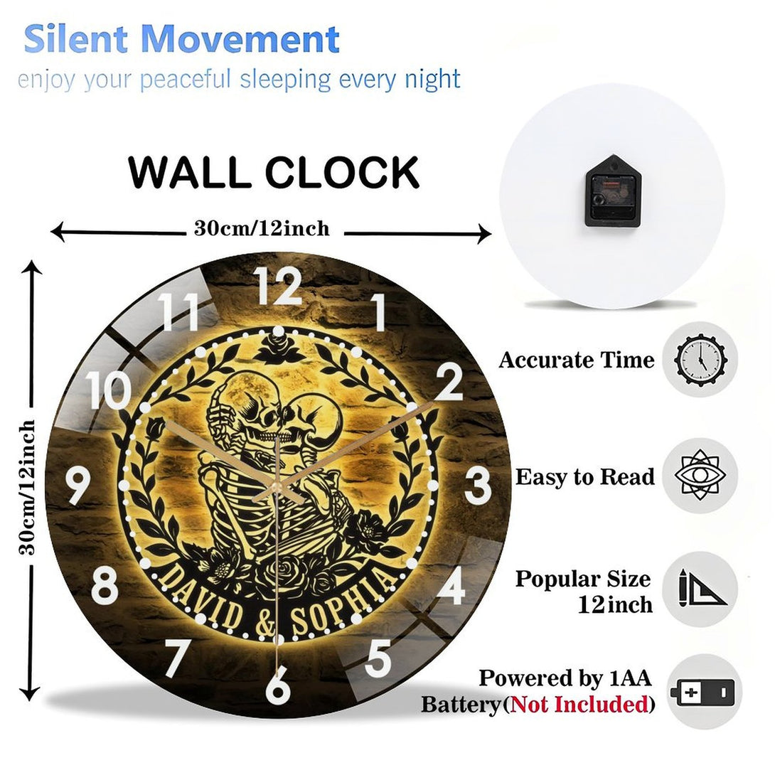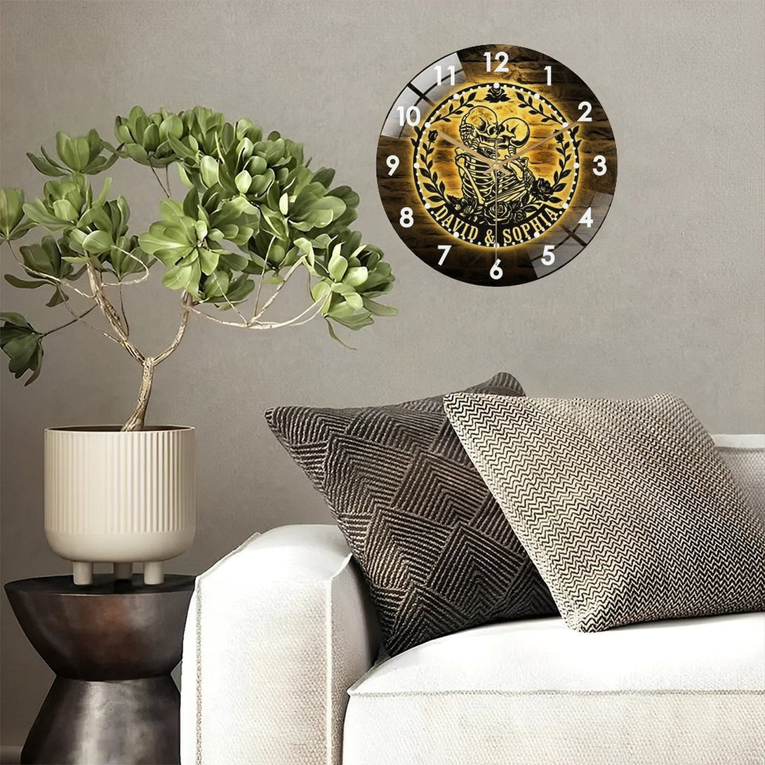 Skeleton Couple Kissing with Roses Glass Wall Clock– Skeleton Couple Wall Clock for Home Decor Wedding Gift Decor. Hallo-ween Valentine Gift, Skull Lover Gift, Gothic Home Decor, Wedding Gift,12×12inch(30×30cm)