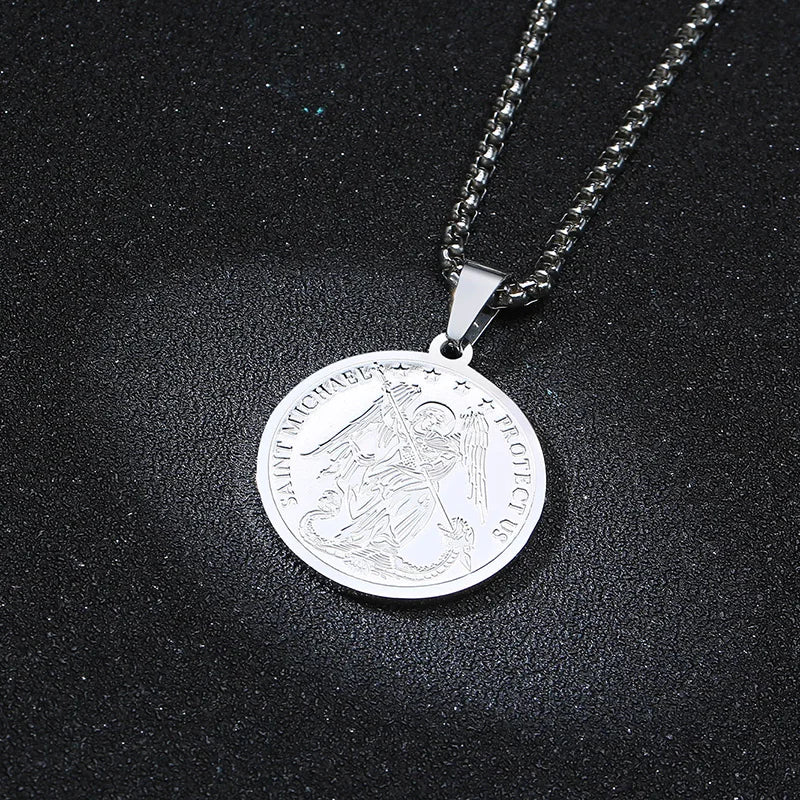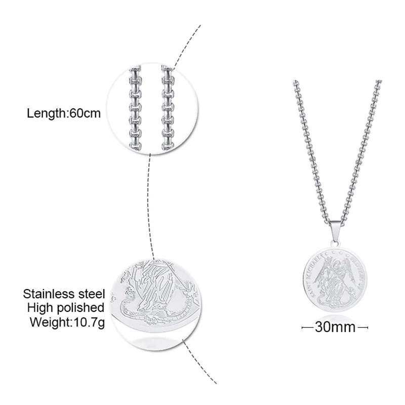 DEFEND US IN BATTLE SAINT MICHAEL MEDAL INSPIRATIONAL PENDANT FOR MEN STAINLESS STEEL SAINT MICHAEL PROTECT US NEKLACE 24INCH