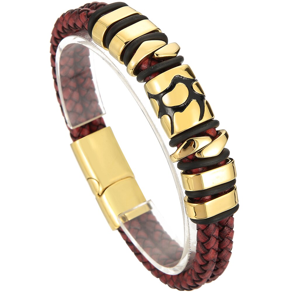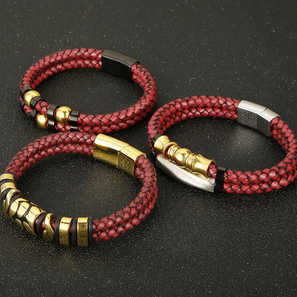 Double Layer Red Leather Wrap Bracelet for Men Gold Plated Steel Men Bracelets