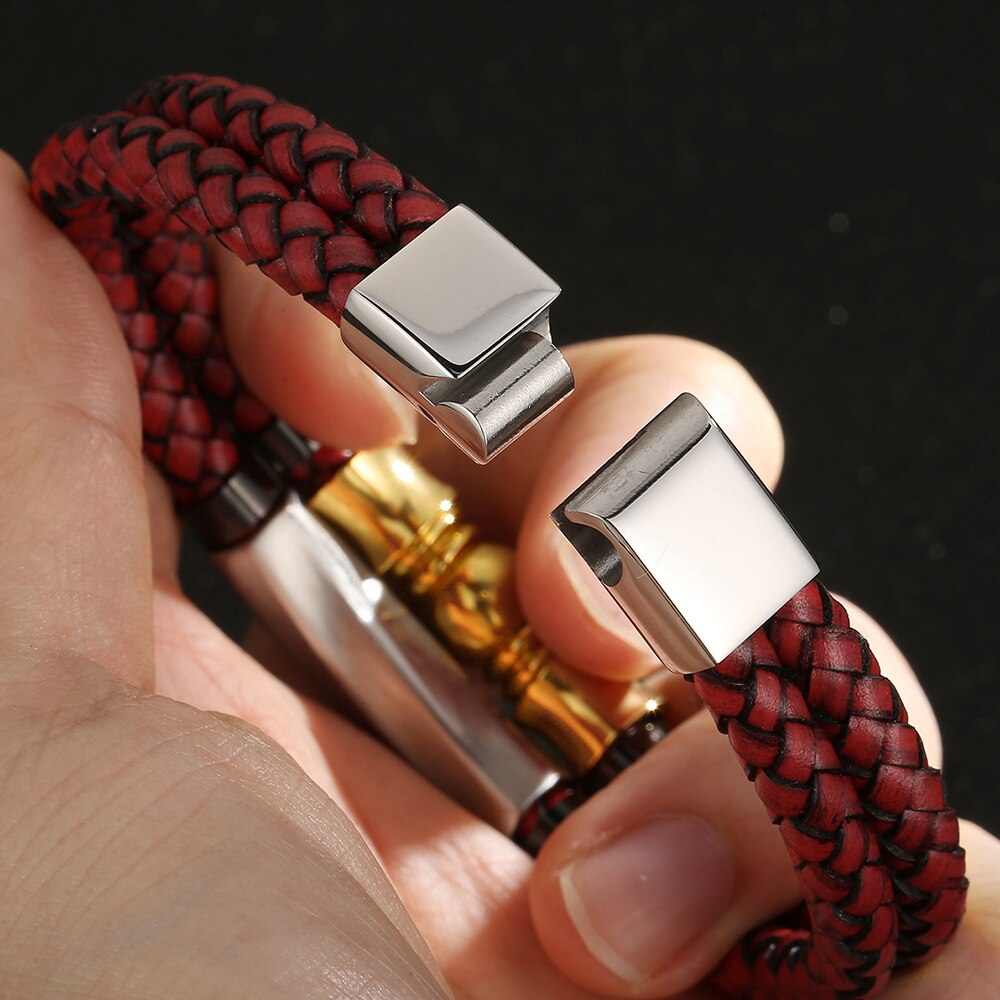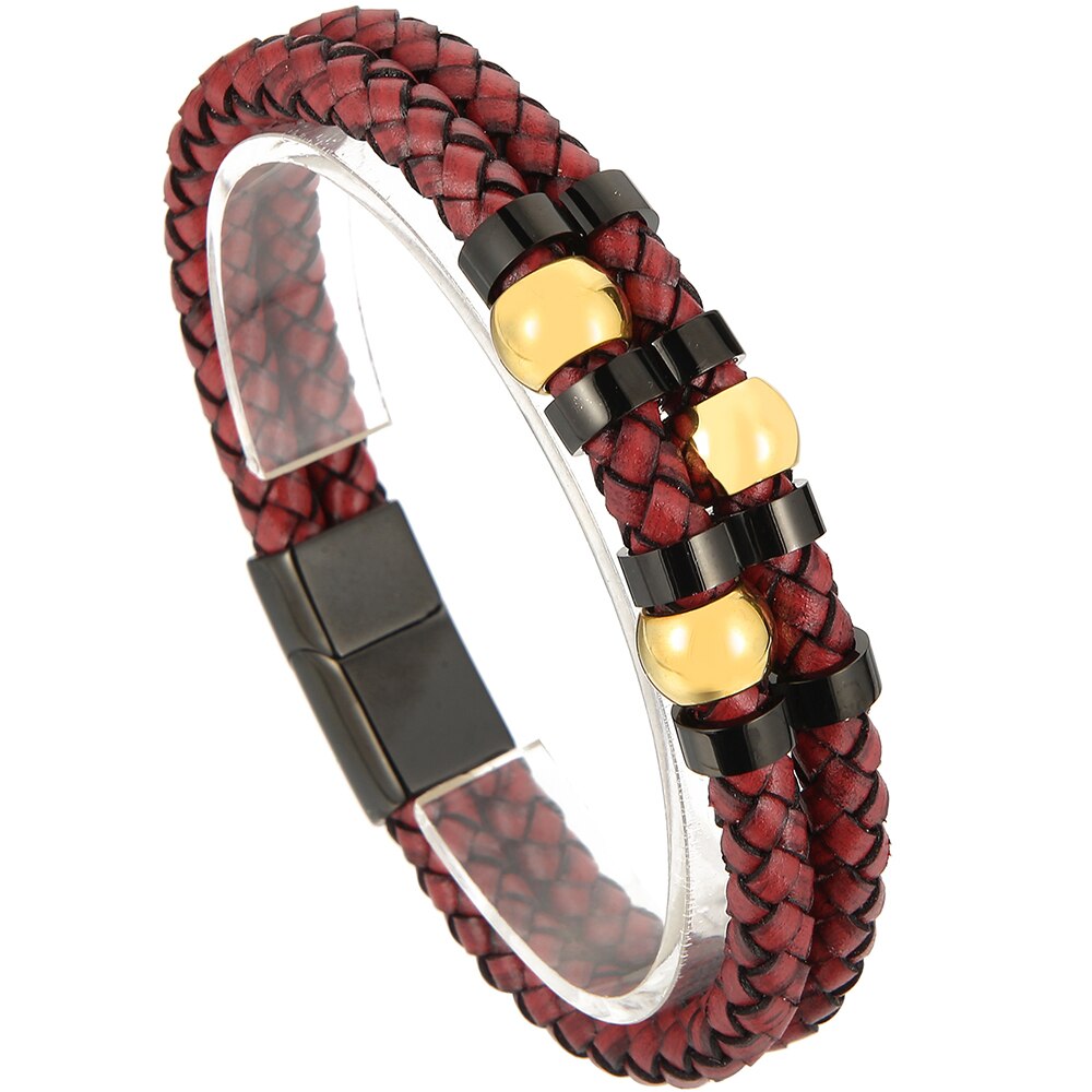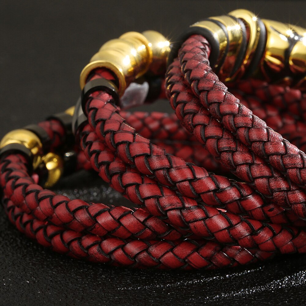 Double Layer Red Leather Wrap Bracelet for Men Gold Plated Steel Men's Bracelets With Magnet Clasp On Hand Wrist Strap Jewellery