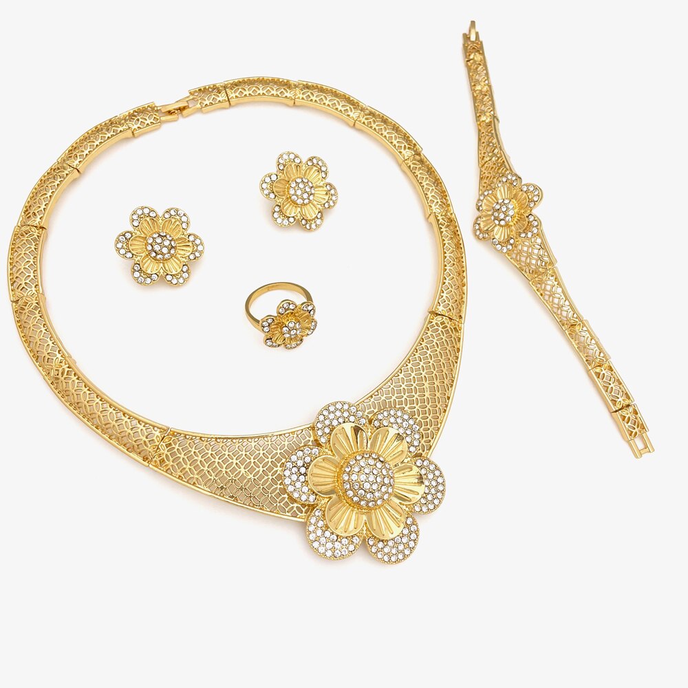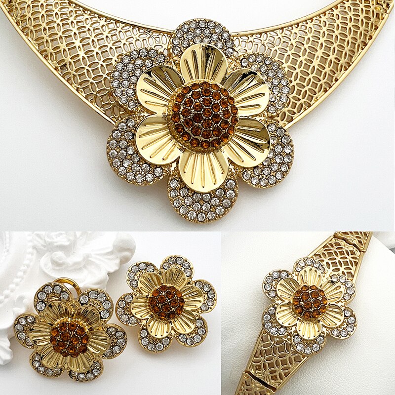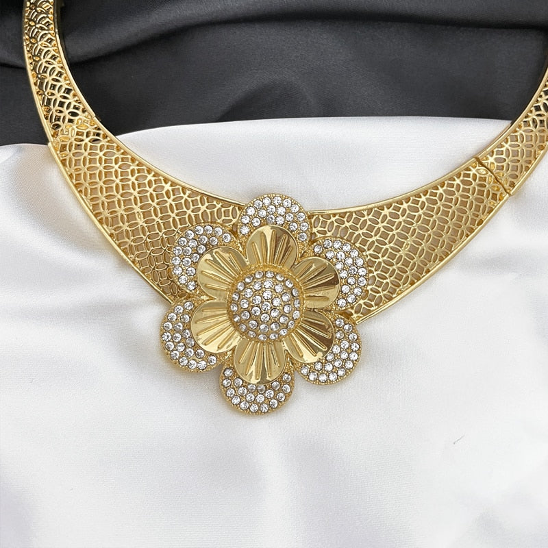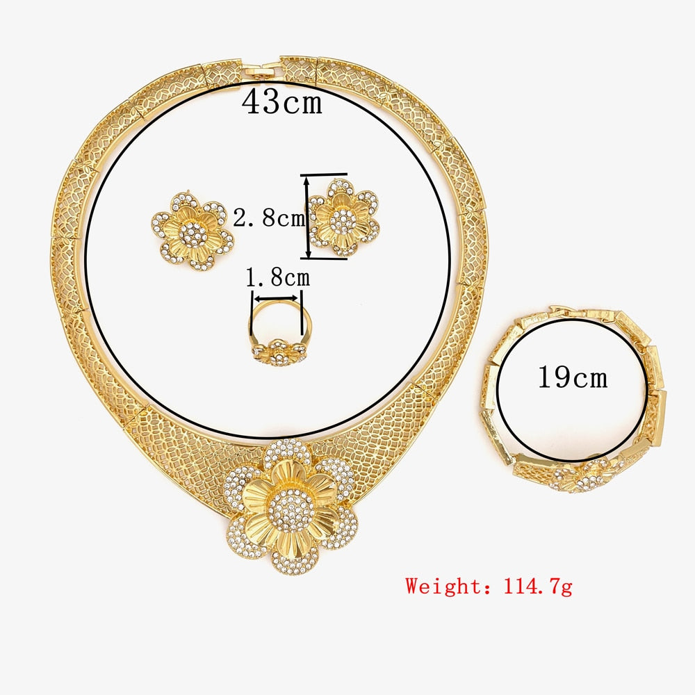 Dubai Gold Color Flower Shape Jewelry Set Inlays White Rhinestone Hollow Out Alloy Necklace Designs For Women Wedding Party Gift