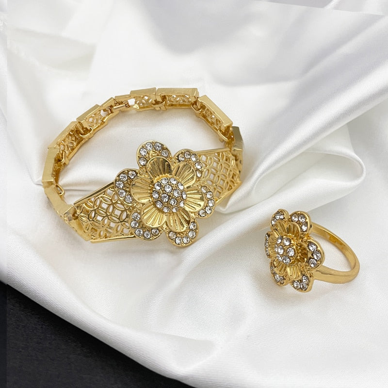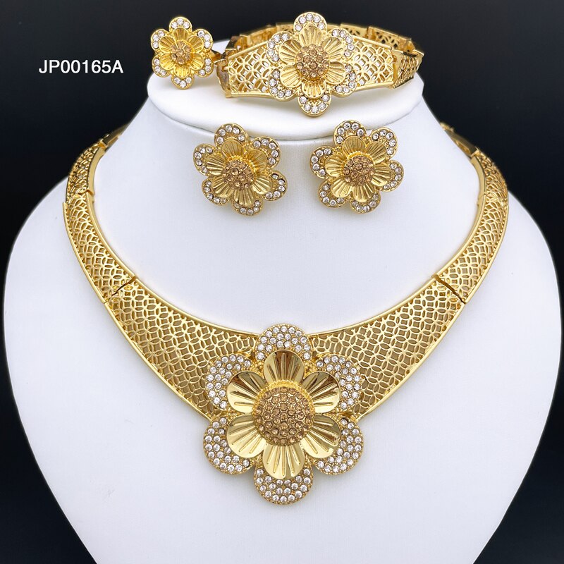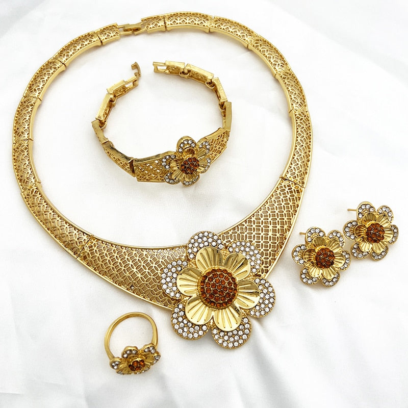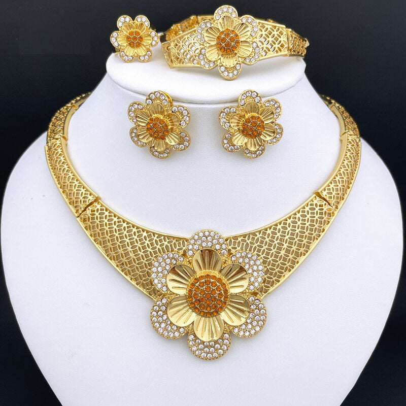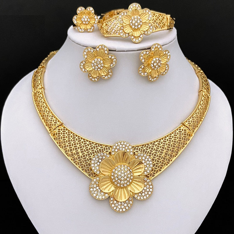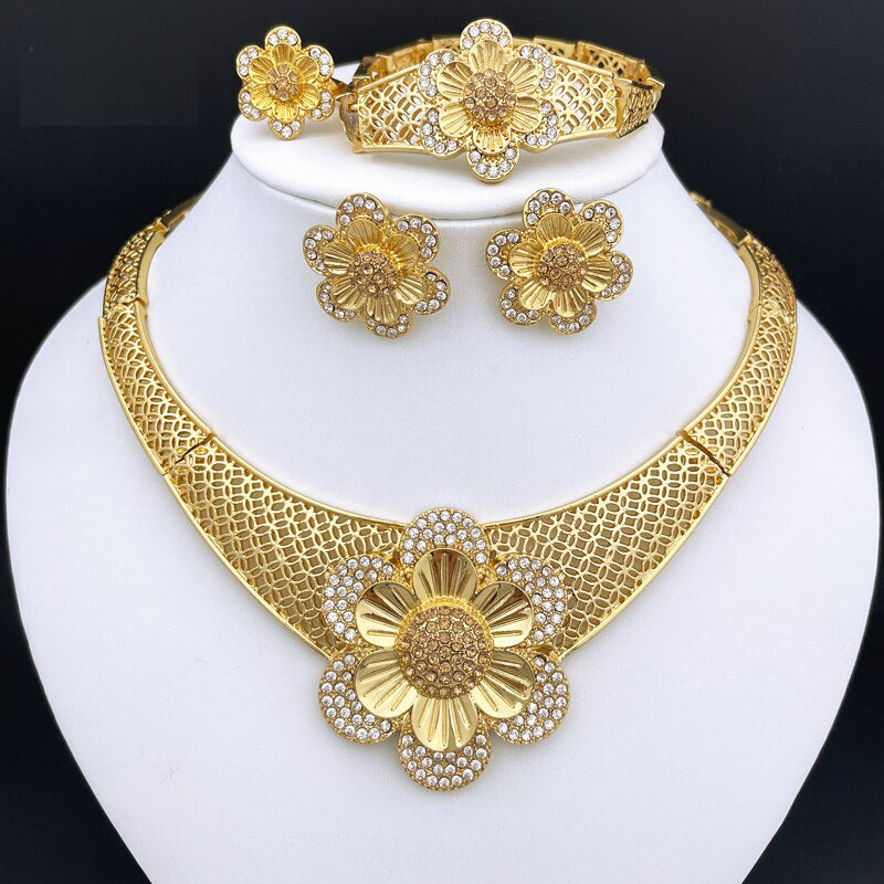Dubai Gold Color Flower Shape Jewelry Set Inlays White Rhinestone Hollow Out Alloy Necklace Designs For Women Wedding Party Gift