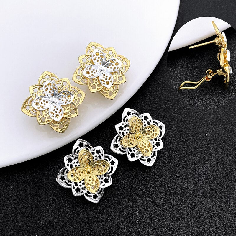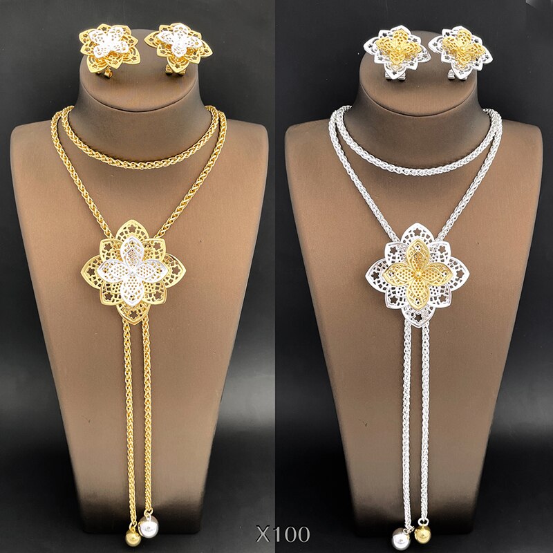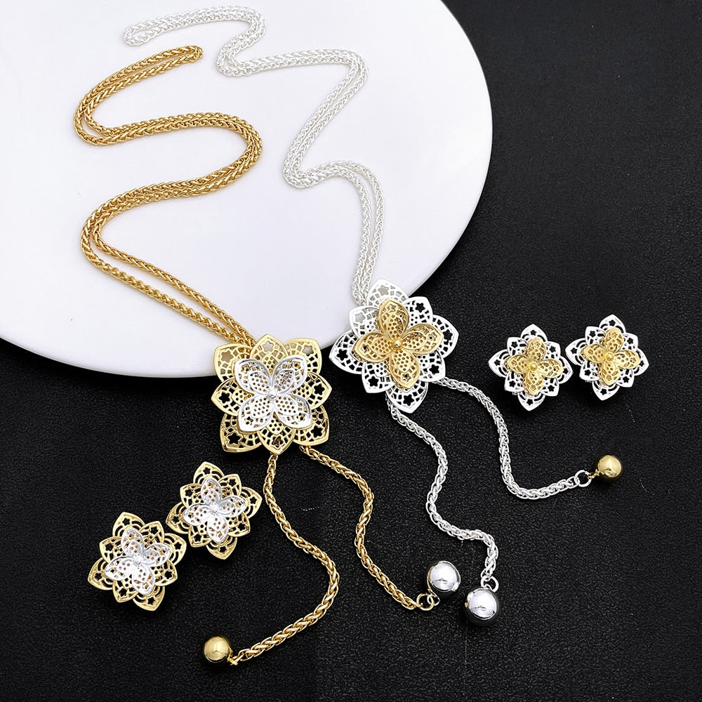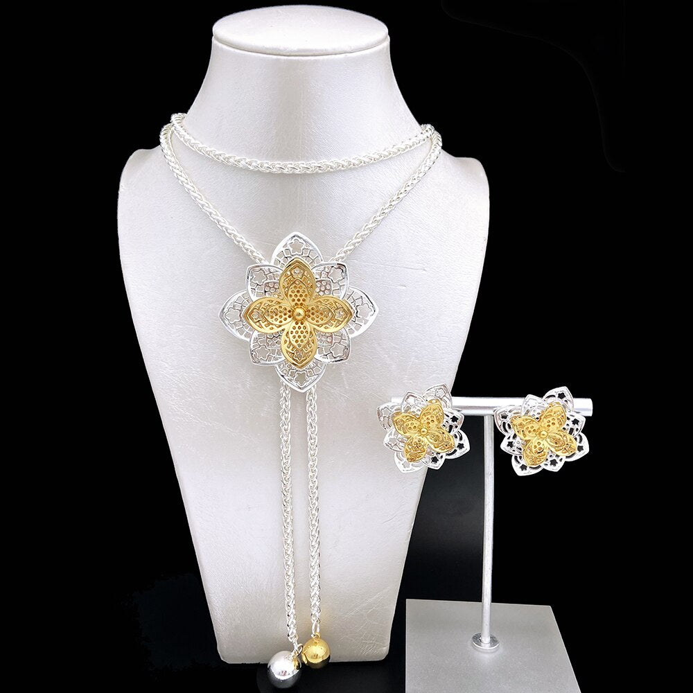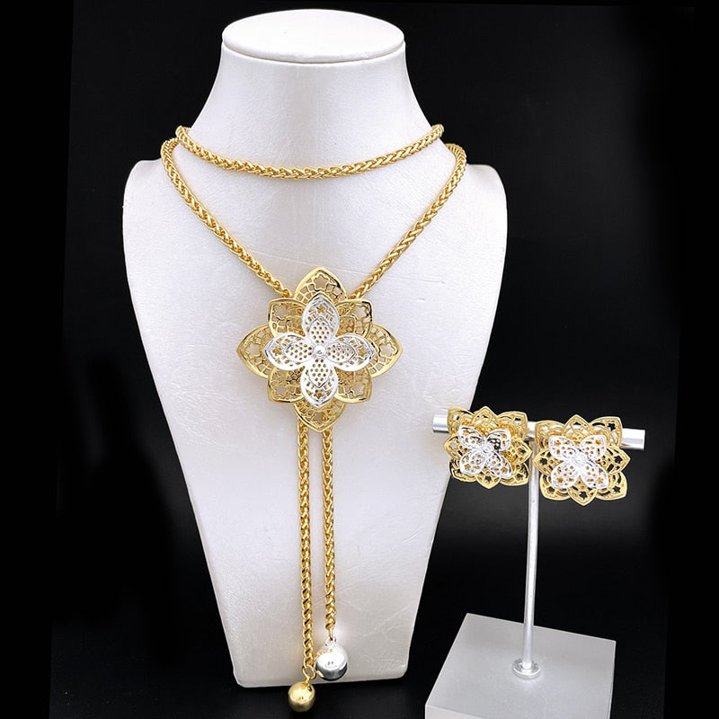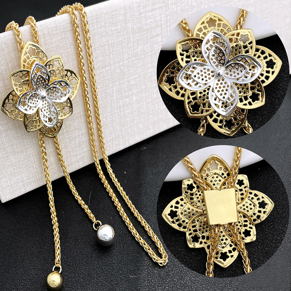 Long Necklace With Large Flower Metal Pendant Gold Color Earrings Set For Women Wedding Party Gift