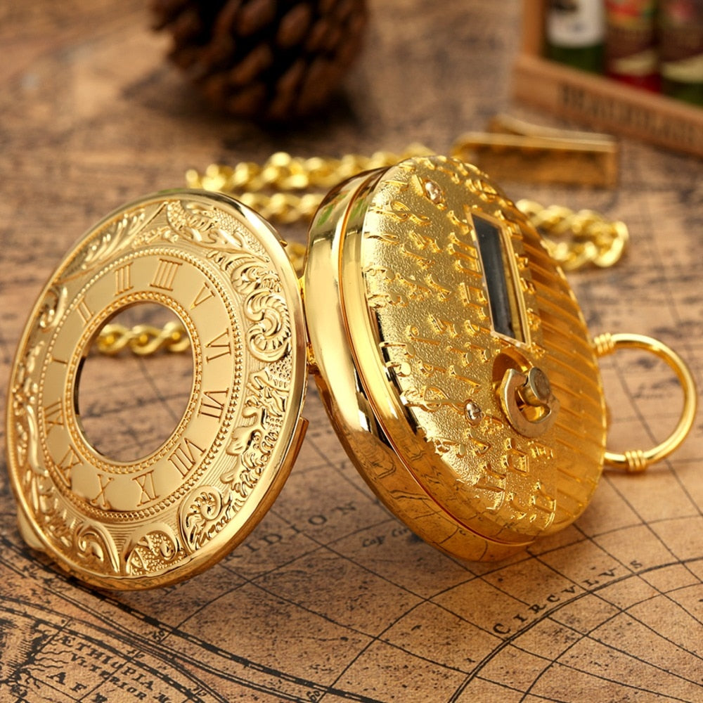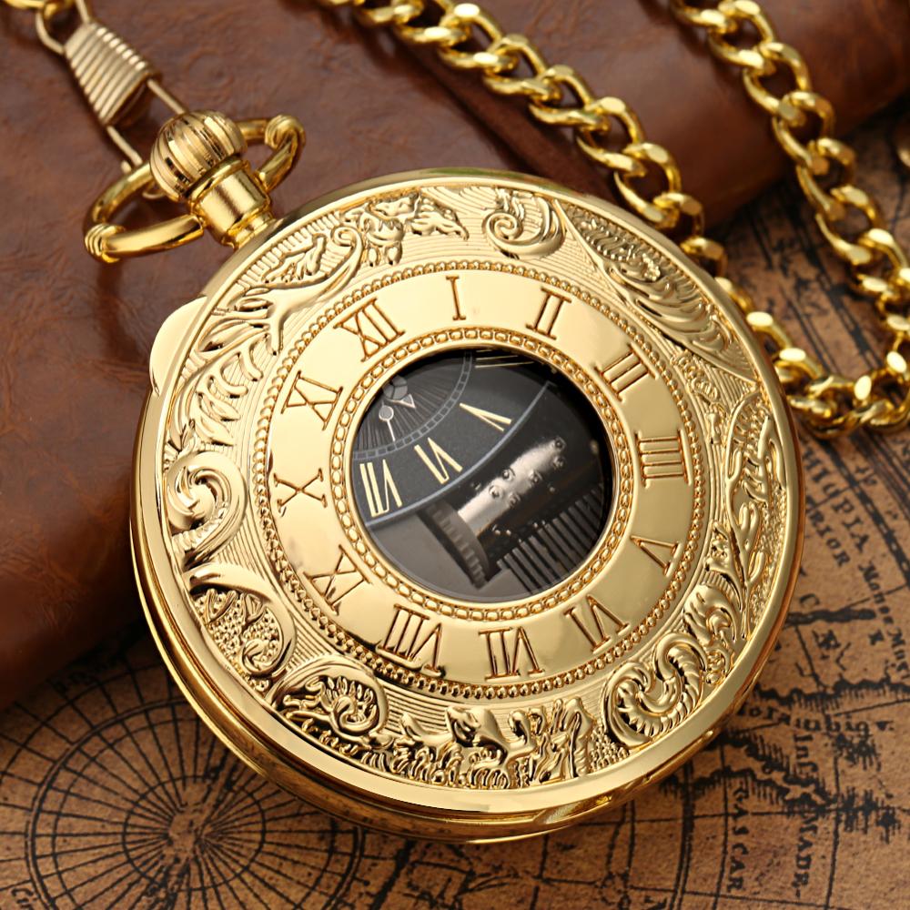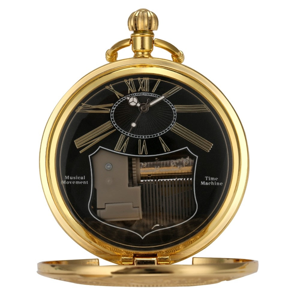 Pocket & Fob Watches--Exquise Gold Musical Movement Pocket Watch Hand Crank Playing Music Watch Chain Roman Number Carved Clock Happy New Year Gifts