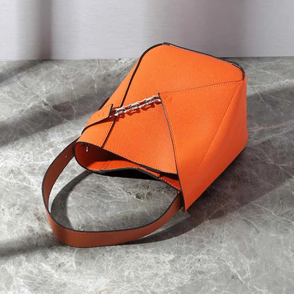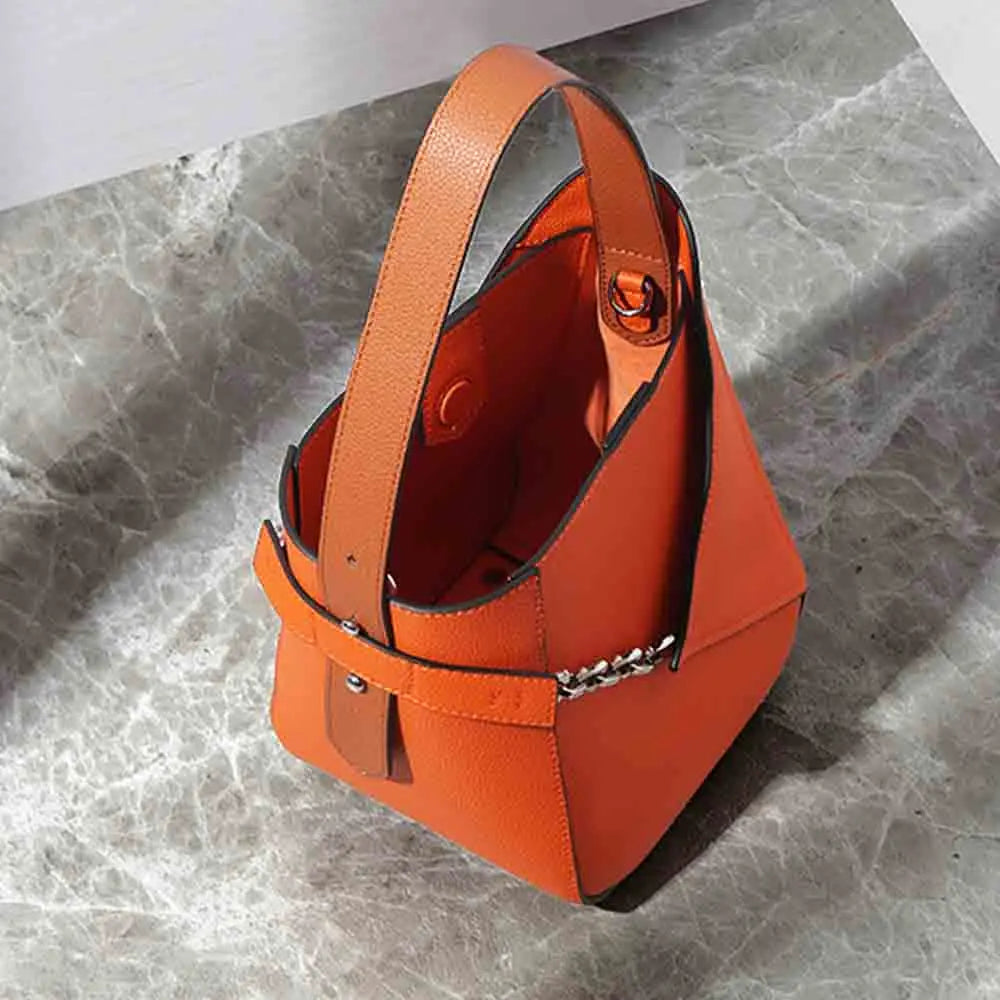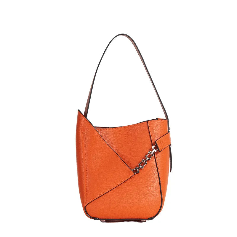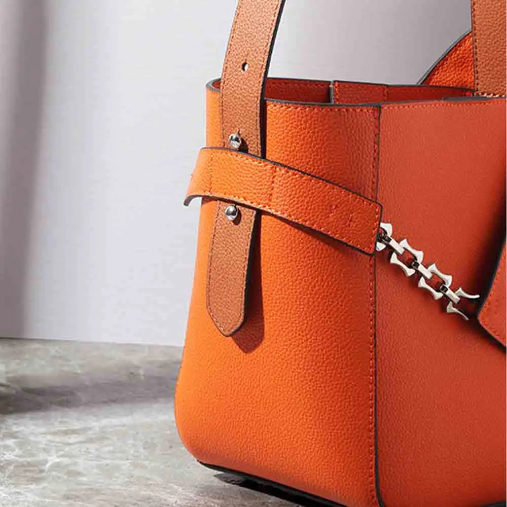 MS Fashion Genuine Leather Bucket Bag for Women European and American Style Luxury Designer Bags Orange Tote Purses New In