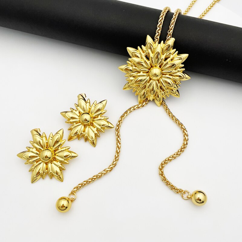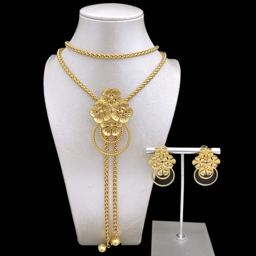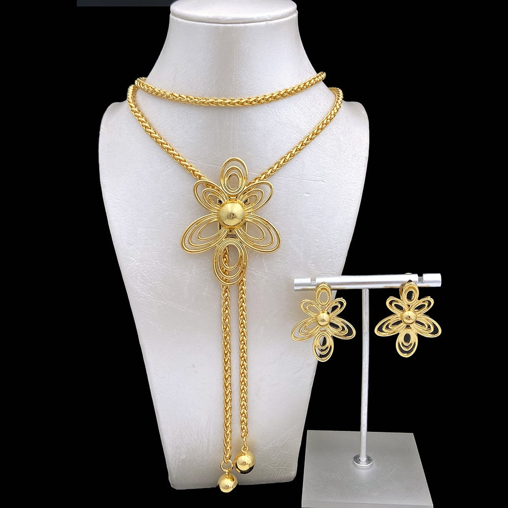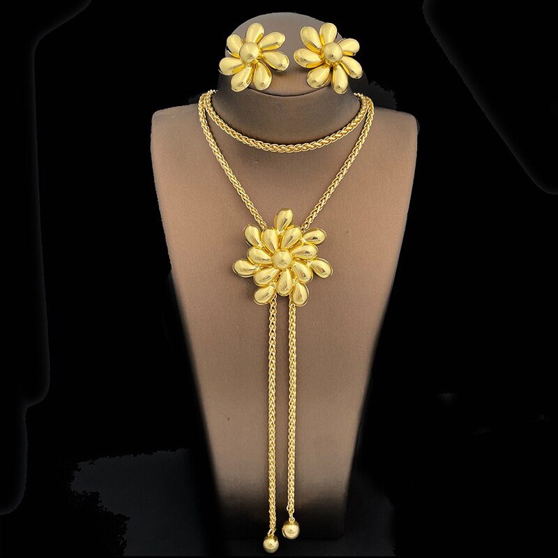 33.5 Inch Long Chain Necklace Earring Set African Gold plated Set Seven Petals Flower Shape Jewelry Match Metal Imitation Pearl