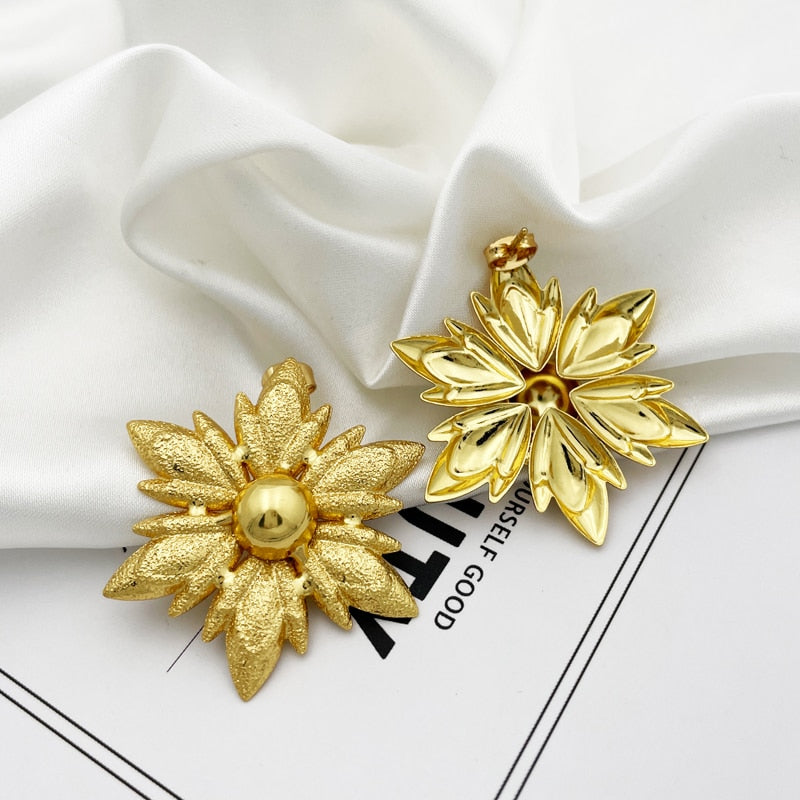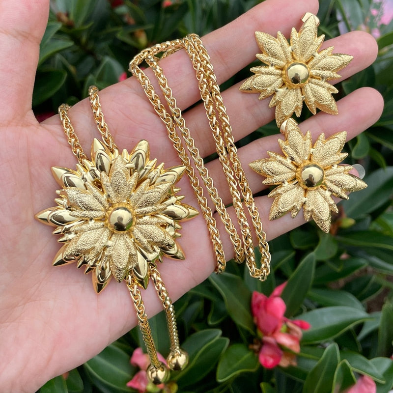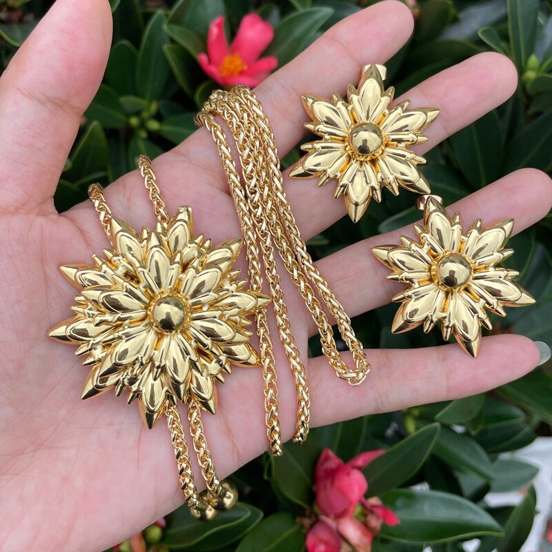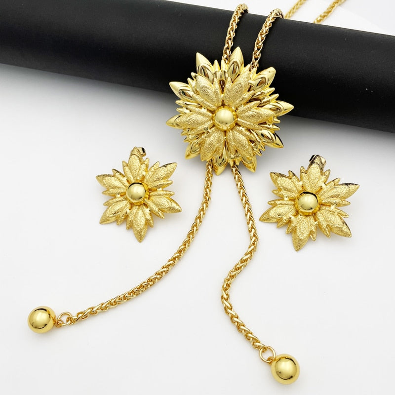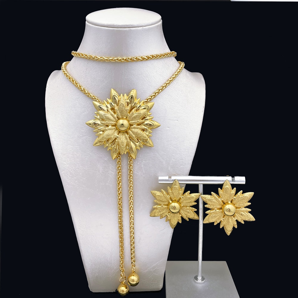 33.5 Inch Long Chain Necklace Earring Set African Gold plated Set Seven Petals Flower Shape Jewelry Match Metal Imitation Pearl