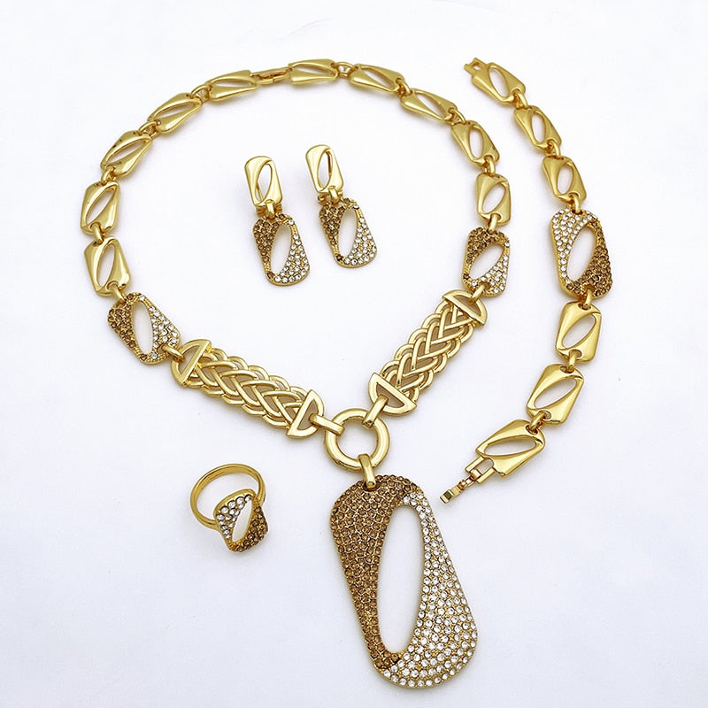 New Women Jewelry Sets Dubai Gold Necklace Round Earrings Adjustable Bracelet Ring Prom Banquet Wedding Party Jewelry