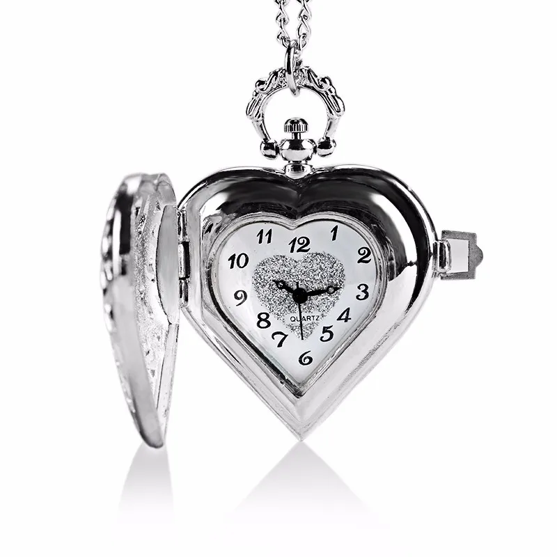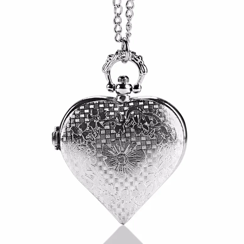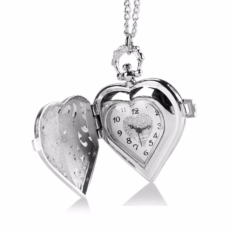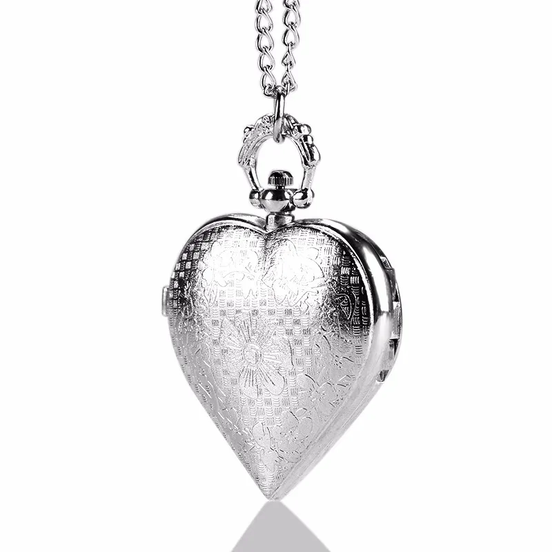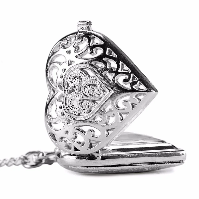 Pocket & Fob Watches-Fashion Silver Heart Shaped Lovely Hollow Elegant Quartz Pocket Watch Necklace Pendant for Women Ladies girl Birthday Gift
