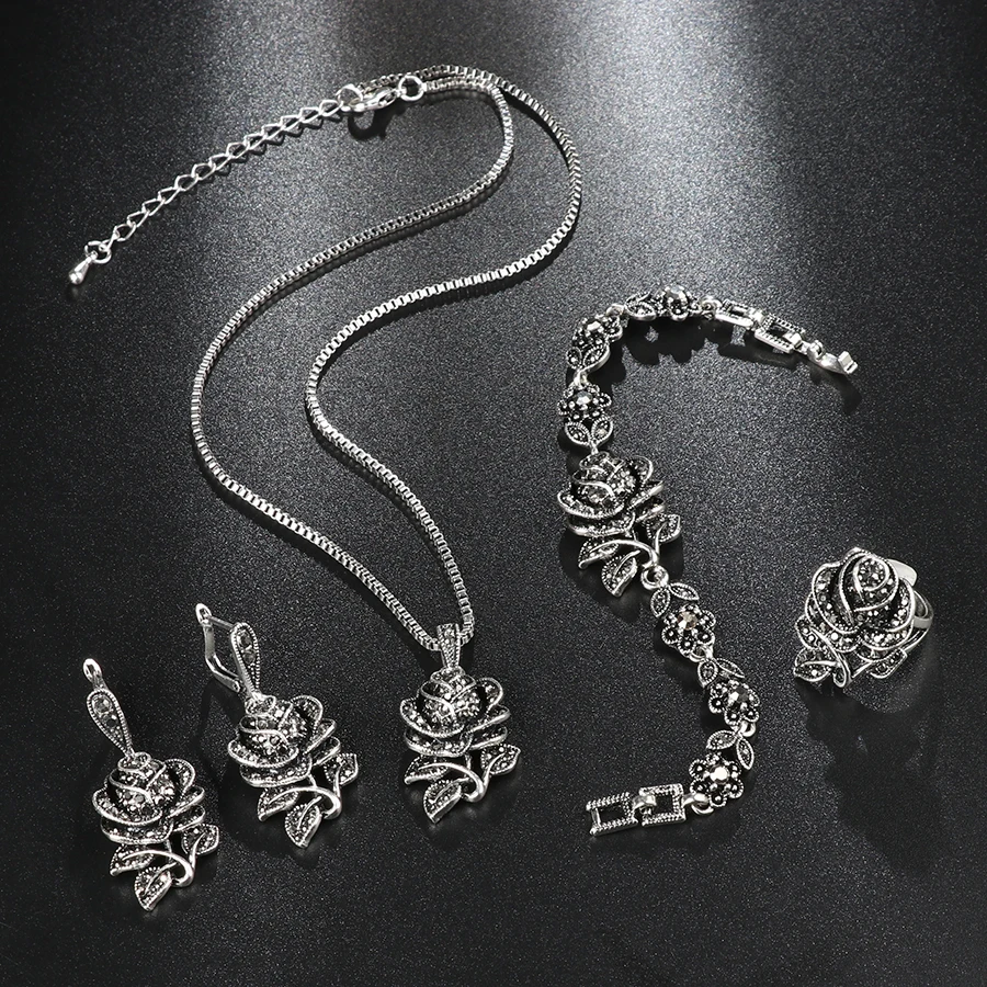 Fashion Tibetan Silver Vintage Wedding Jewellery Set Black Crystal Rose Flower Ring Jewelry Sets For Women Party Gift