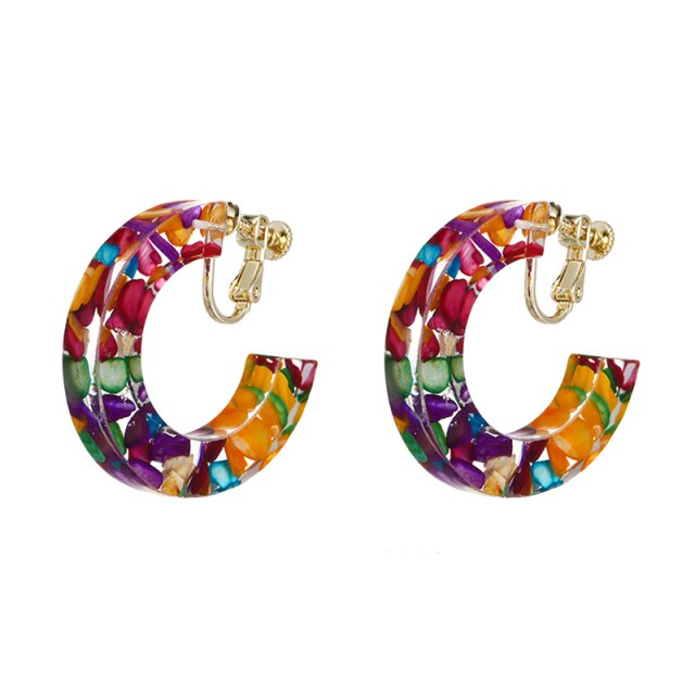Fashion Earrings- Fashion Women's C Shaped Hoop Clip on Earrings 2022 Vintage Resin Shell gravel Earrings for Non Pierced Woman Ear Clips Jewelry