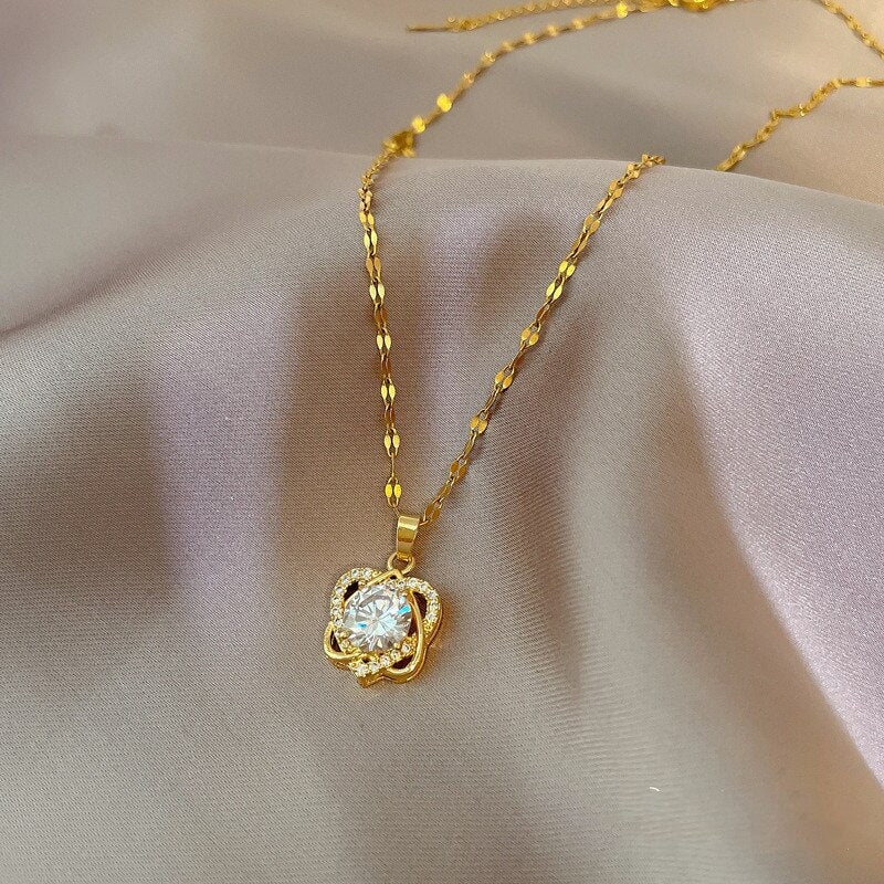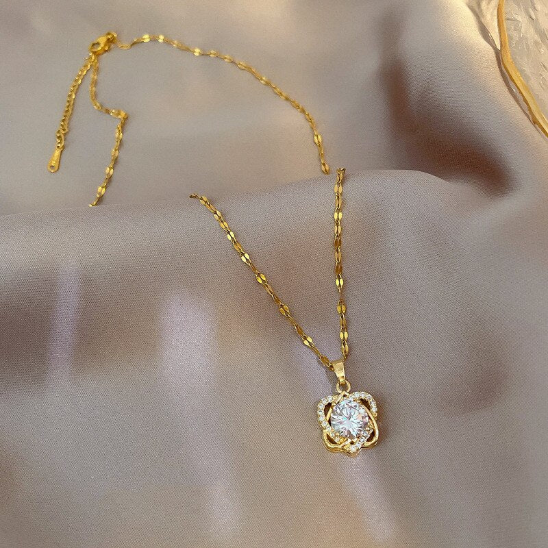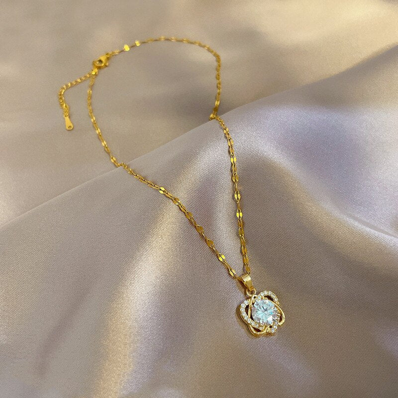 585 Gold Jewelry-Stainless Steel Flower Necklace for Women Fashion Versatile Flower Pendant Luxury Inlaid Cubic Zirconia Exquisite Girls