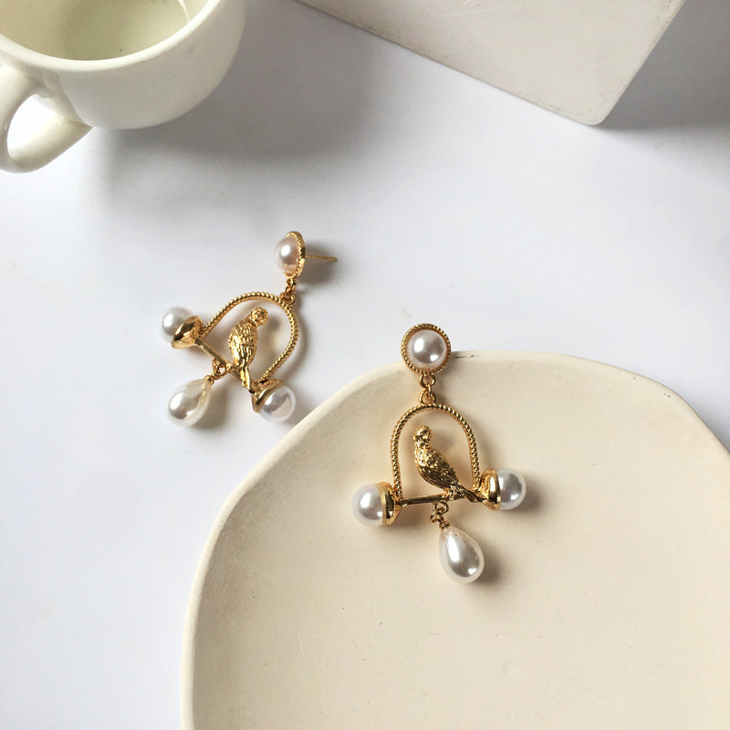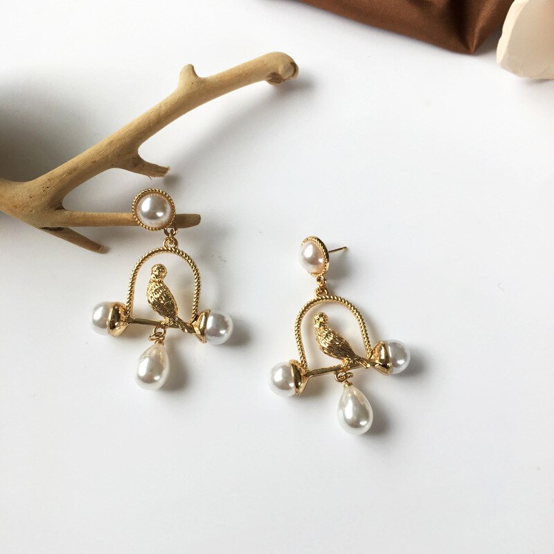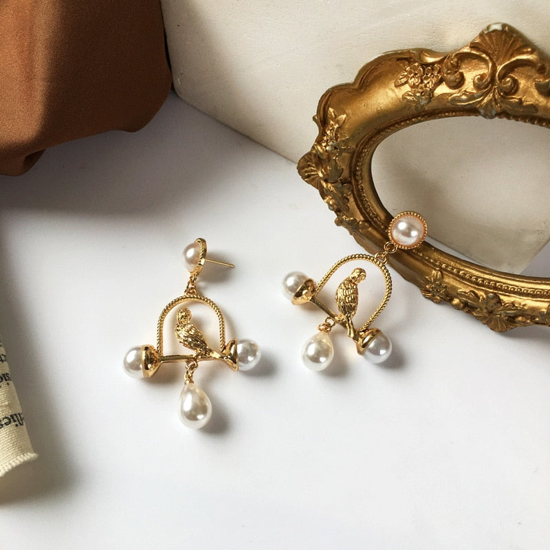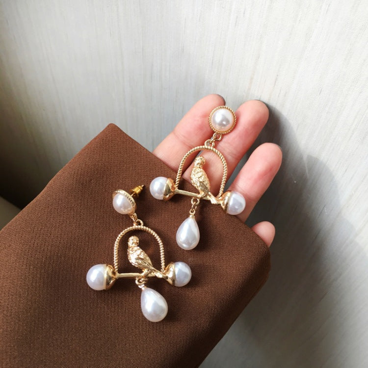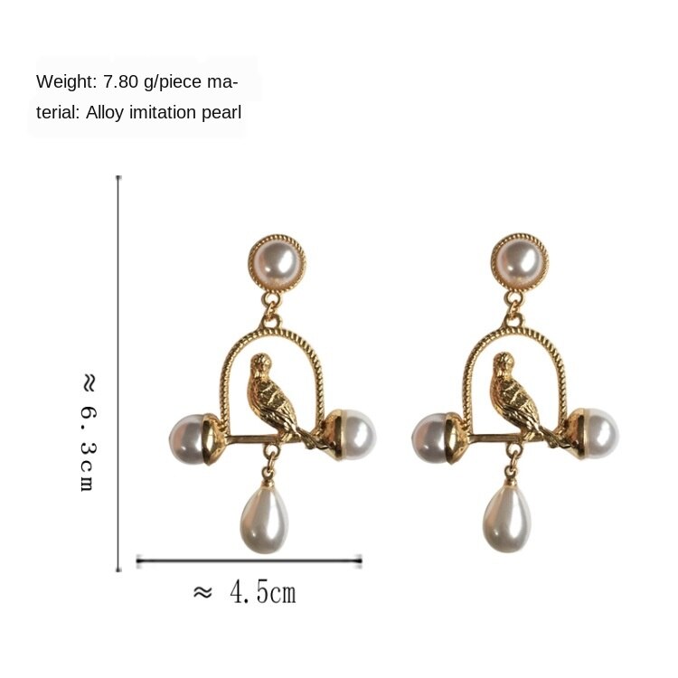 Fashion Earrings-French Statement Palace Bird In Cage Clip on Earrings No Piercing Vintage Baroque Imitation Pearl Bird Clip Earrings No Hole