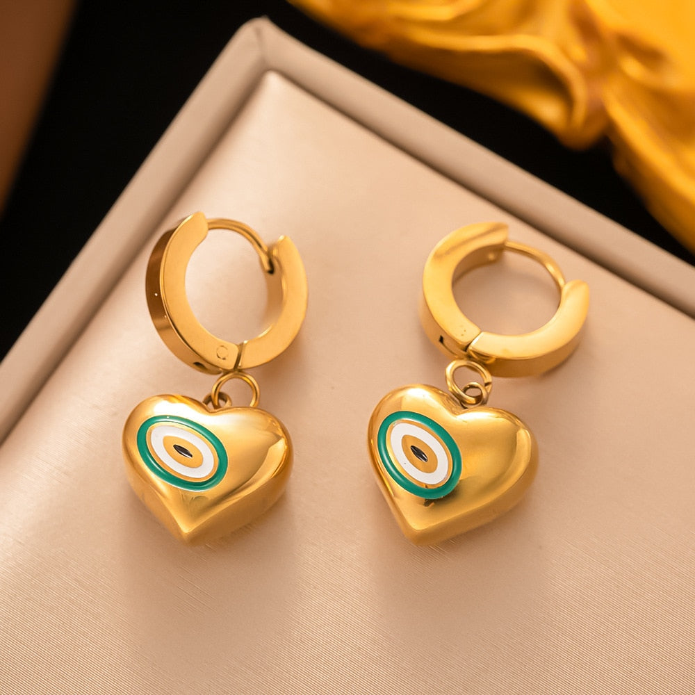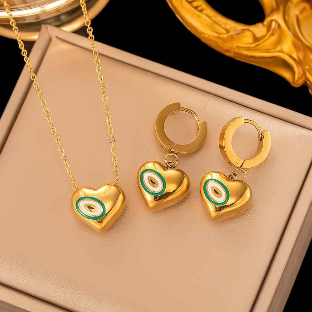 585 Gold Jewelry-316L Stainless Steel Gold Color Bohemian Vinatge Heart Evil Eye Pendant Necklace Earrings For Women Party Jewelry Set