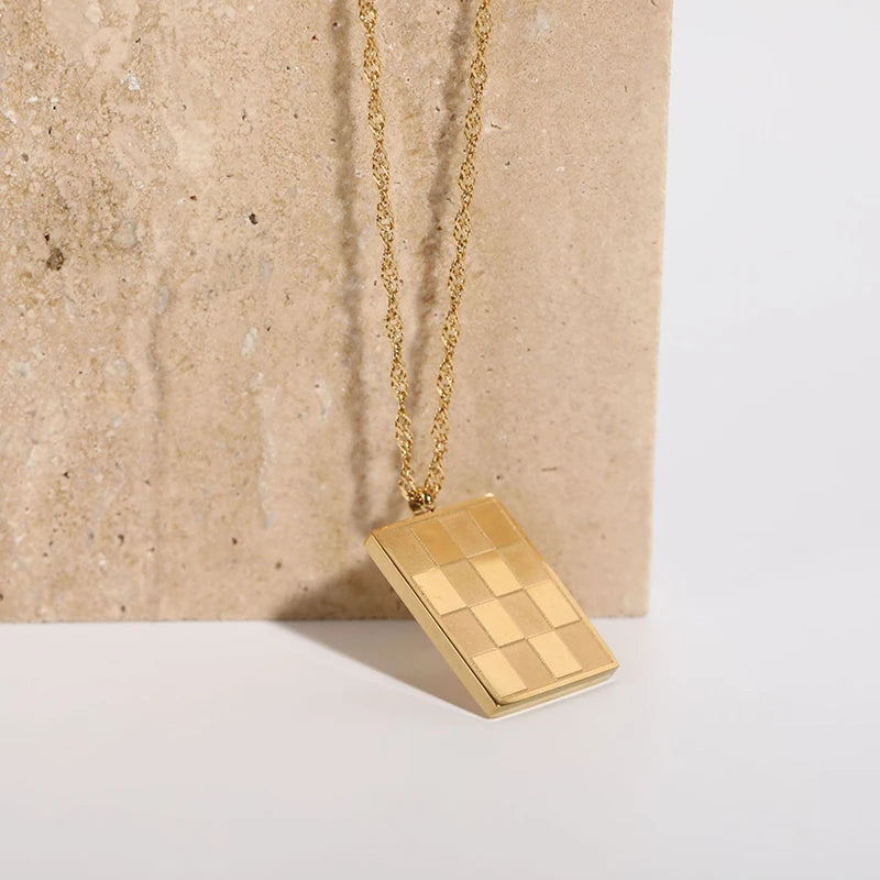 GOLD Color Checkered Necklace Men Women, STAİNLESS STEEL Chess Pendant,Layering Necklace