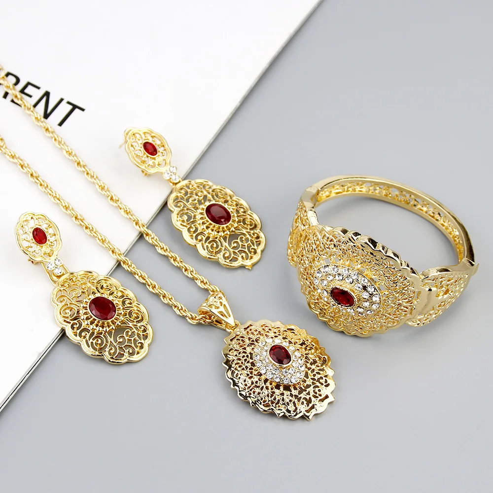 Morocco Wedding Jewelry Set Gold Color Drop Earring Cuff Bracelet Bangle Pendant Necklace Arab Hollow Metal Gift