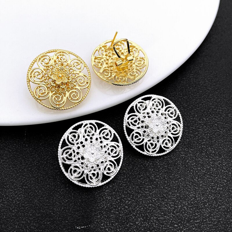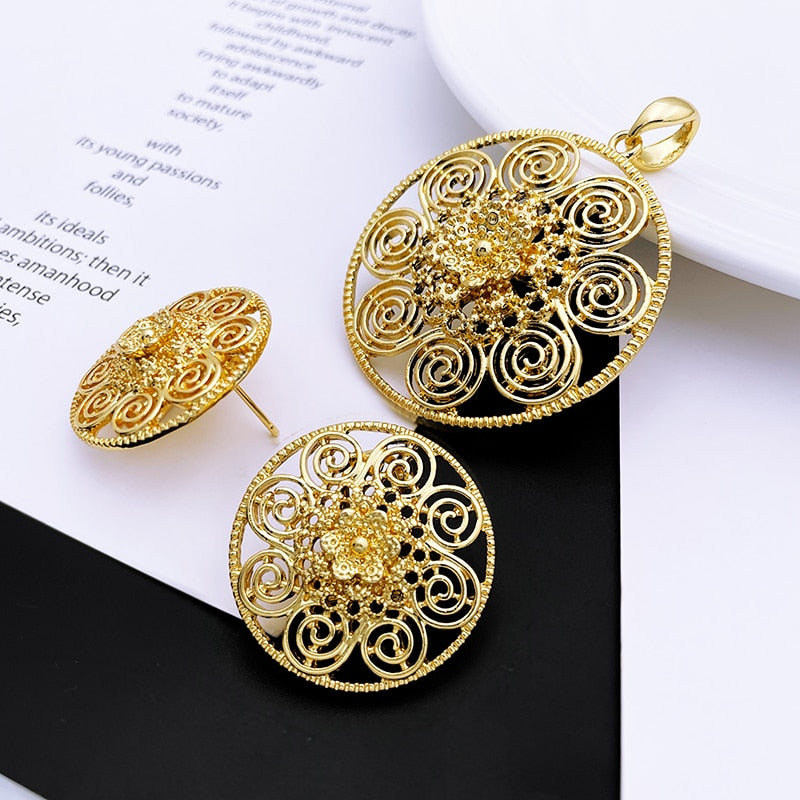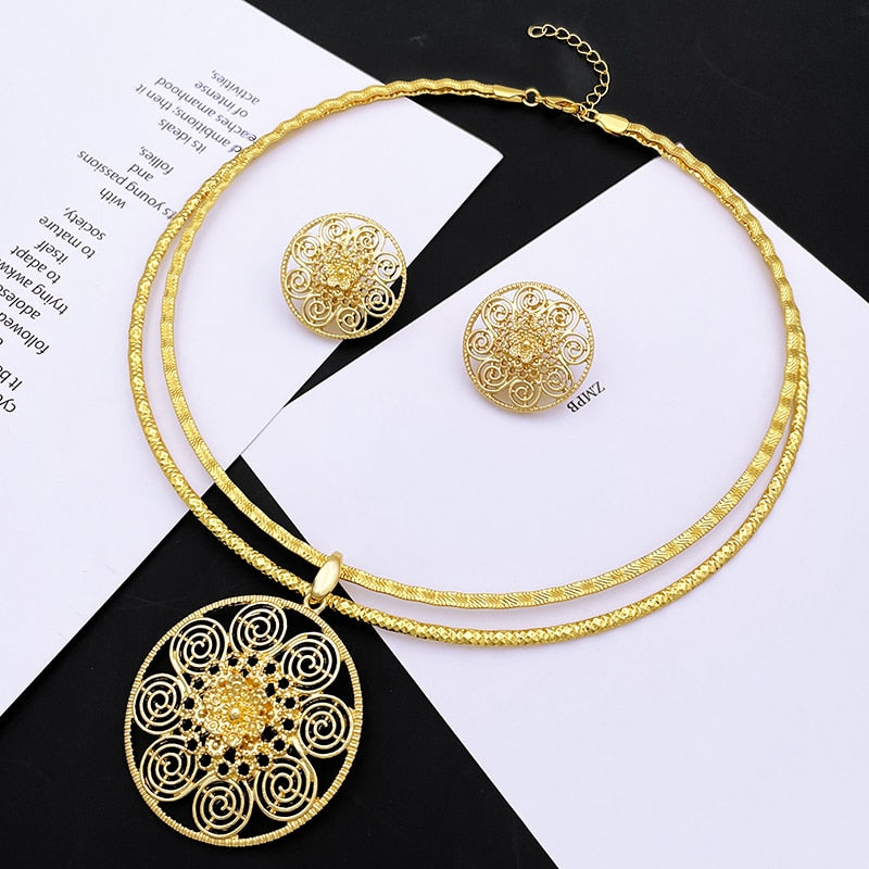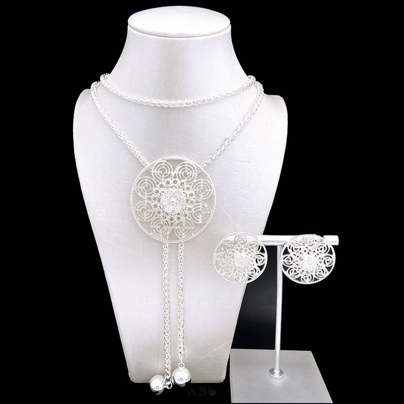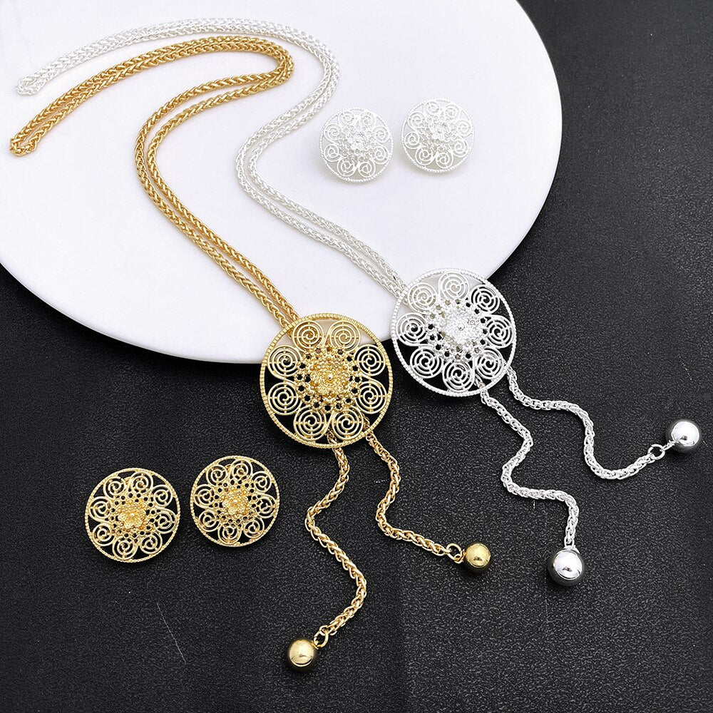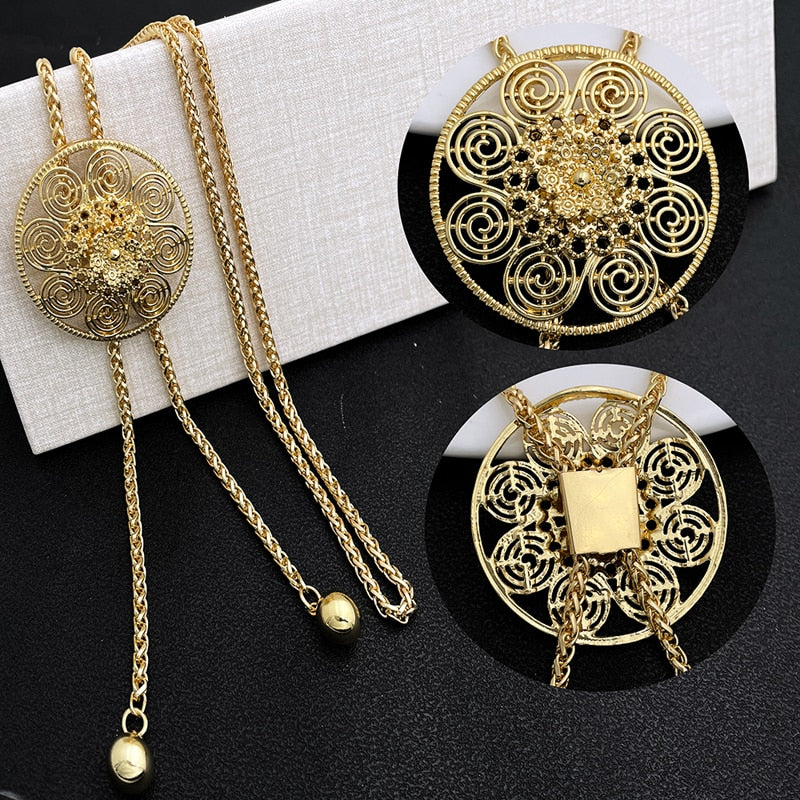 Lady Gold Color Jewelry Set African Dubai Long Chain Necklace Flower Shape Big Pendant Earrings Set Wedding Party Gift