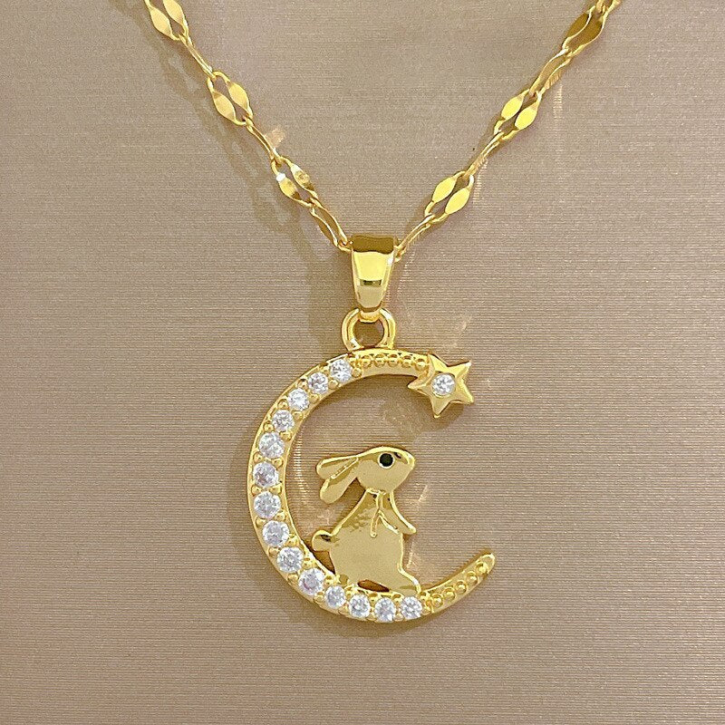 585 Gold Jewelry-316L Stainless Steel Gold Color Korean Sweet Rabbit On The Moon Pendant Necklace For Women Gir Wedding Party Lucky Jewelry