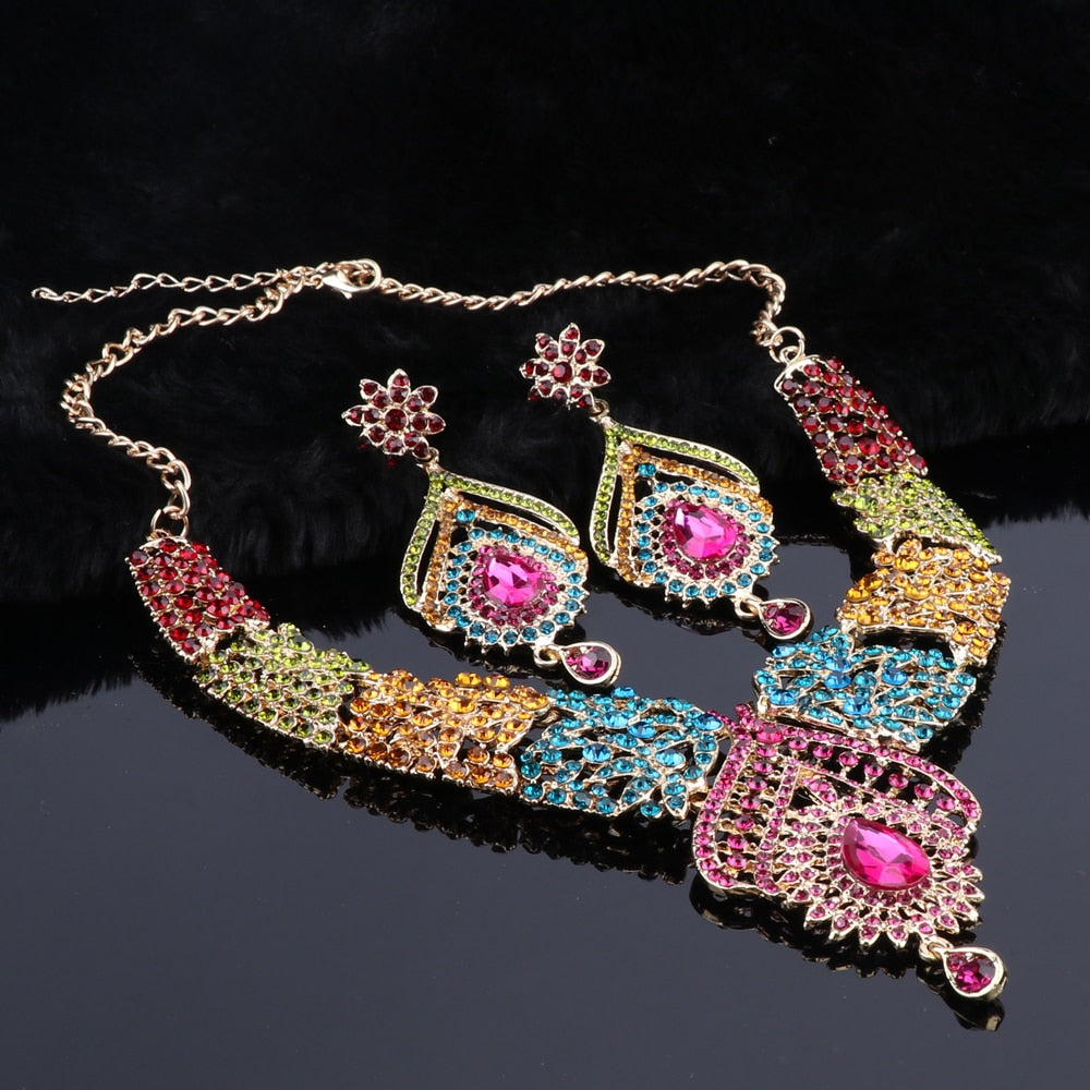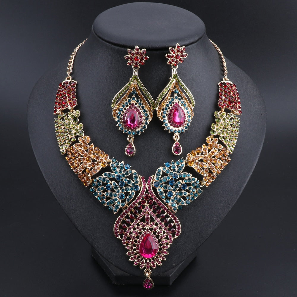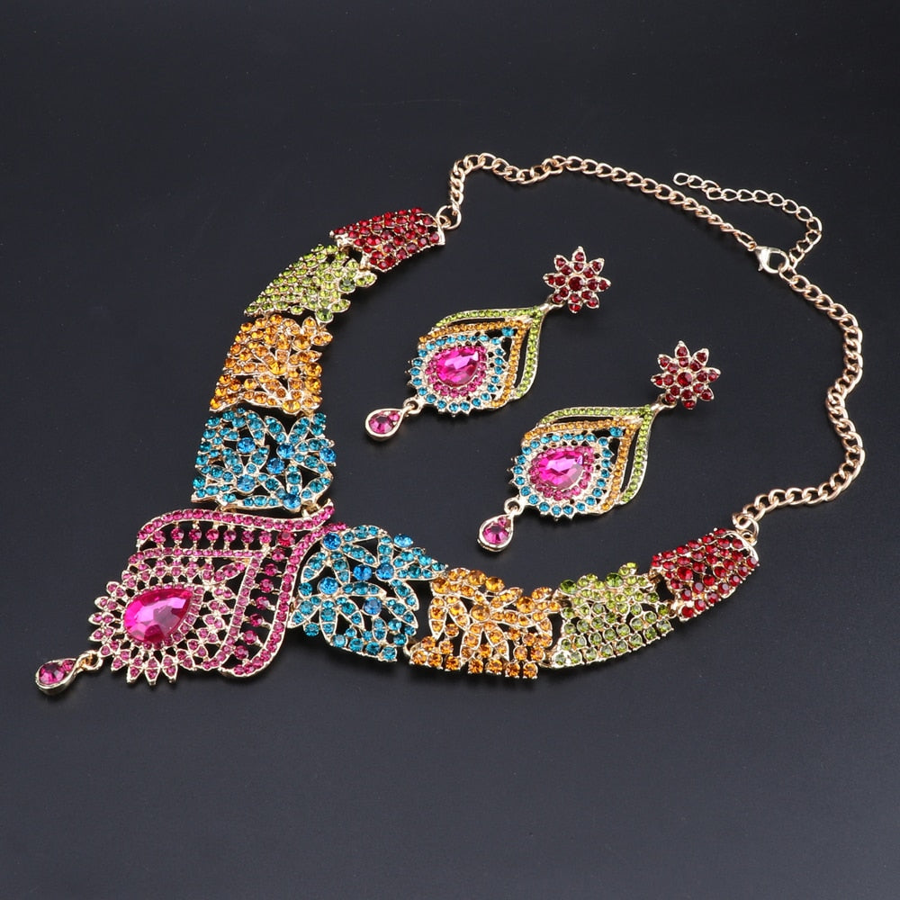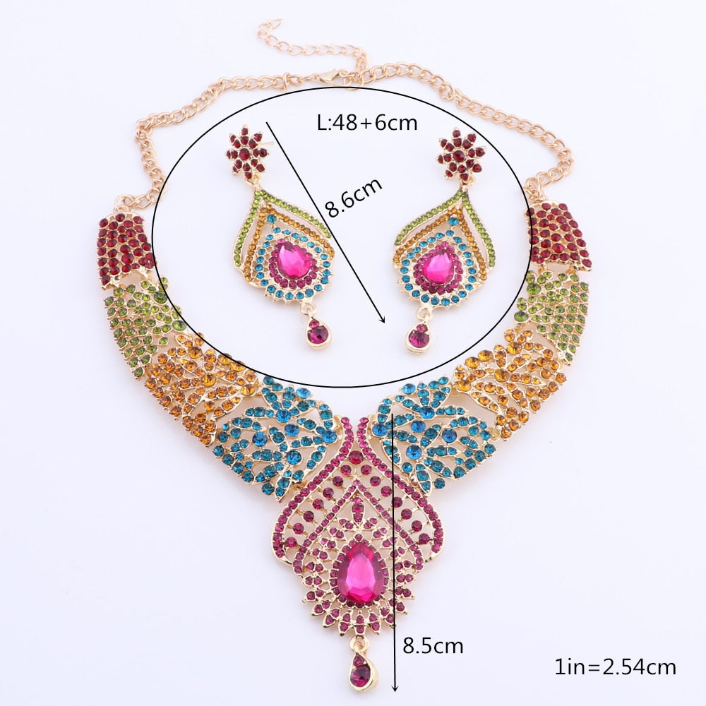 Jewelry set-Hot sale Gold Color Multicolor Crystal Rhinestones Feather shaped Necklace Earrings Set African Bridal Jewelry Sets