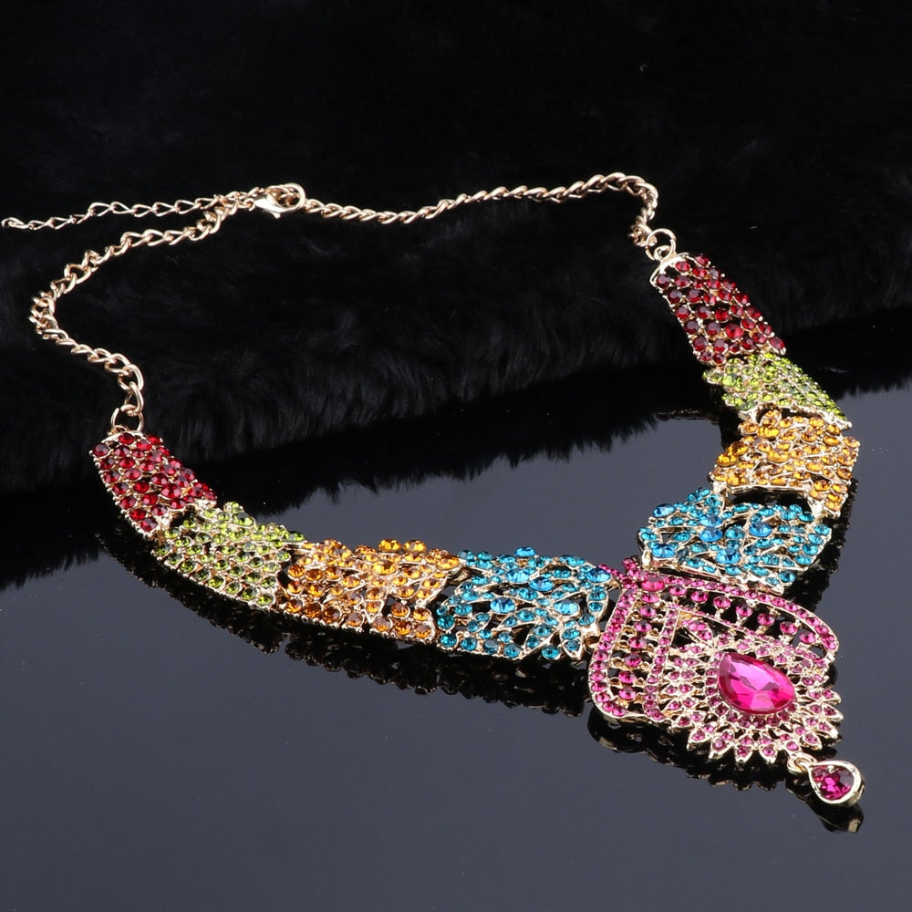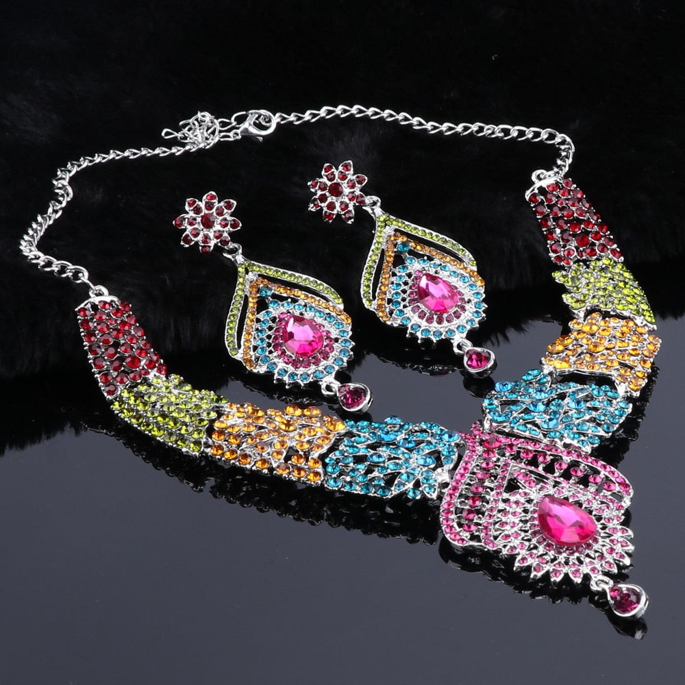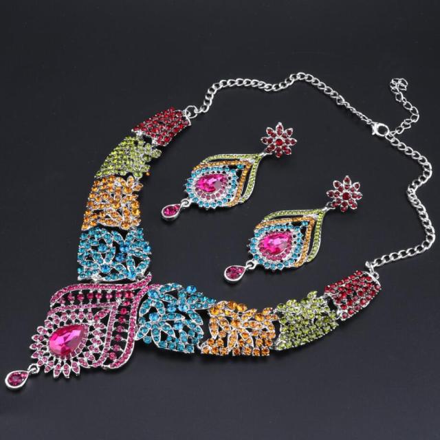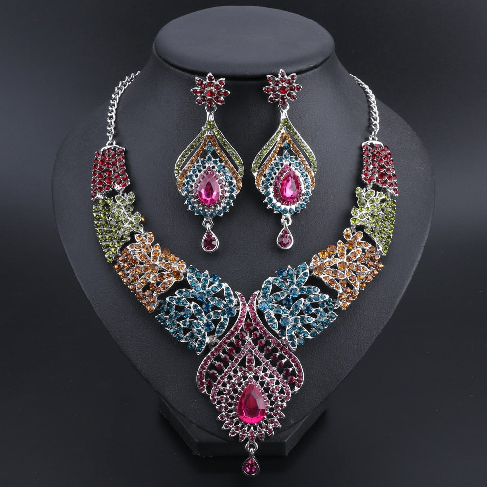 Jewelry set-Hot sale Gold Color Multicolor Crystal Rhinestones Feather shaped Necklace Earrings Set African Bridal Jewelry Sets