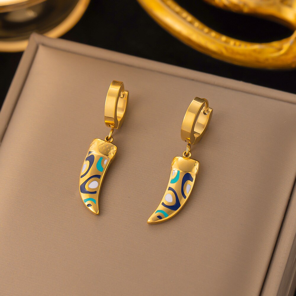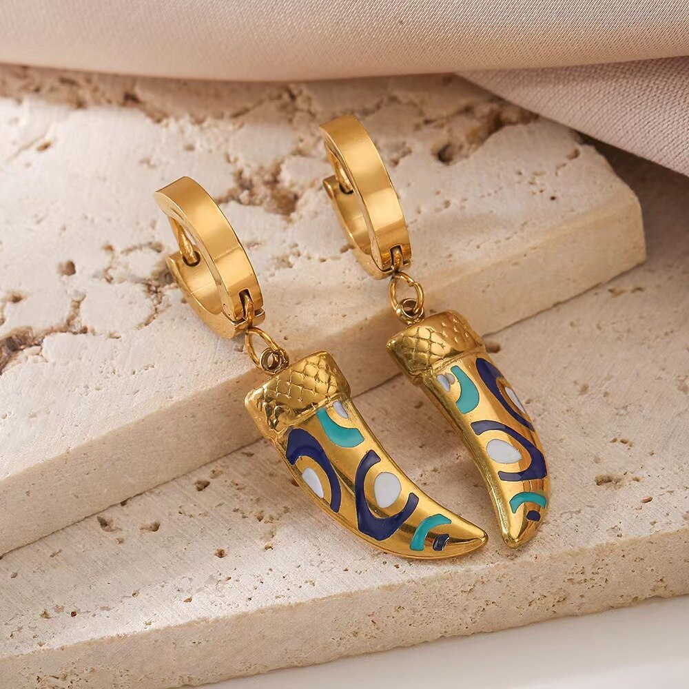585 Gold Jewelry-316L Stainless Steel Gold Color Painted Blue Ethnic Belief Style Ox Horn Necklace Earrings For Women Lucky Jewelry Set