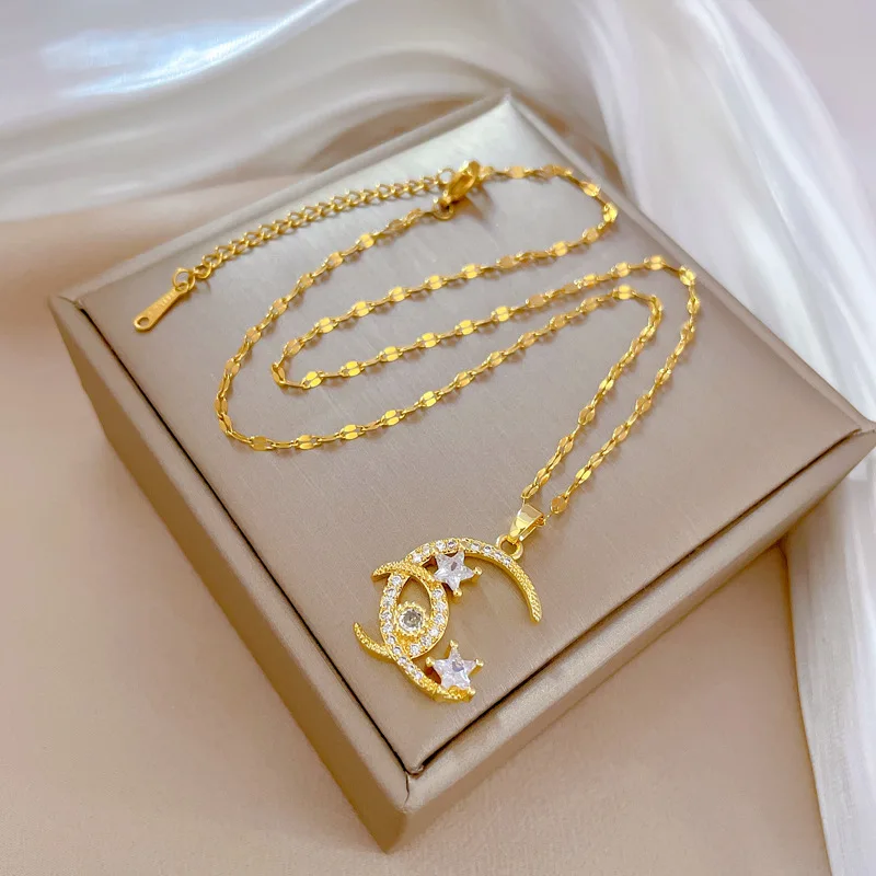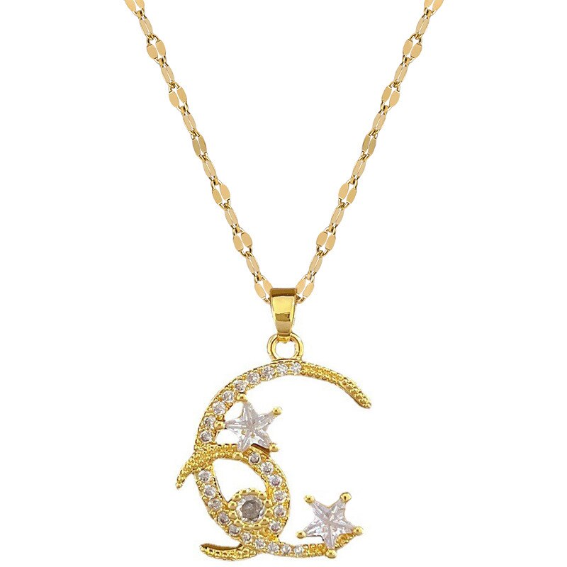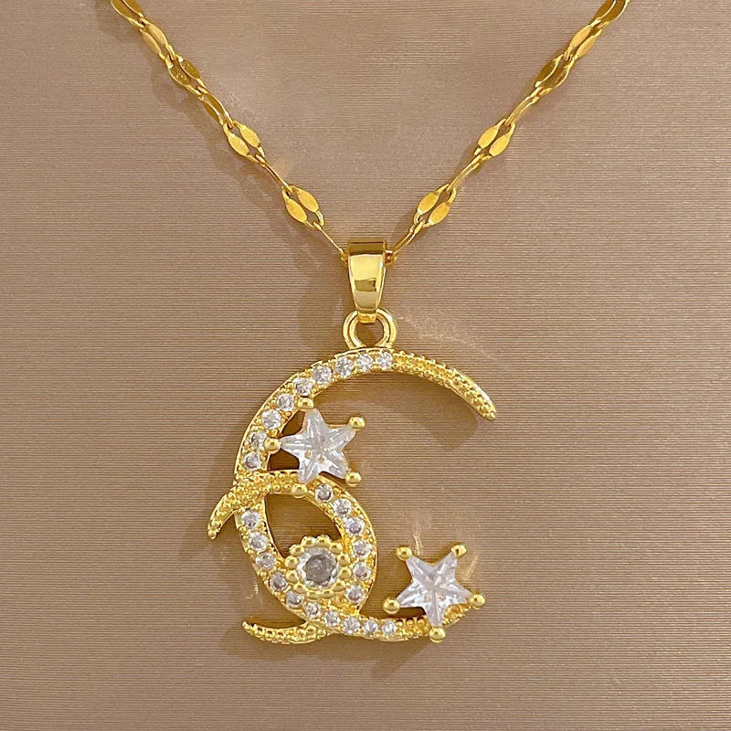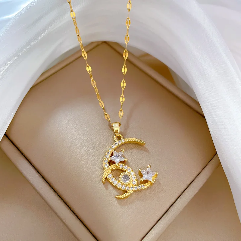 585 Gold Jewelry- 316L Stainless Steel Gold Color Romantic Shine Zircon Moon Star Pendant Necklace For Women New Trendy Jewelry