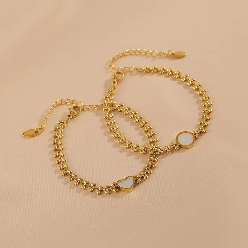 585 Gold Jewelry- 316L Stainless Steel Gold Color Wheat Ear Shape Heart Round Shell Chain Bangle & Bracelet for Women Bohemian Elegant Jewelr