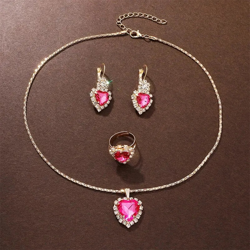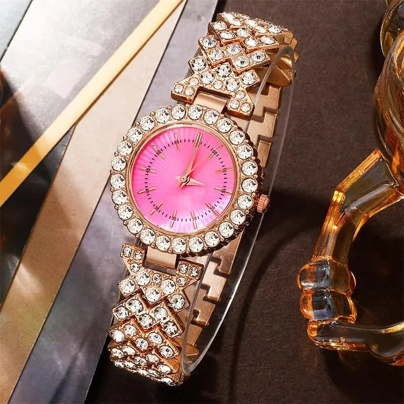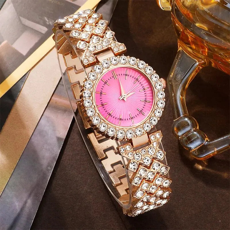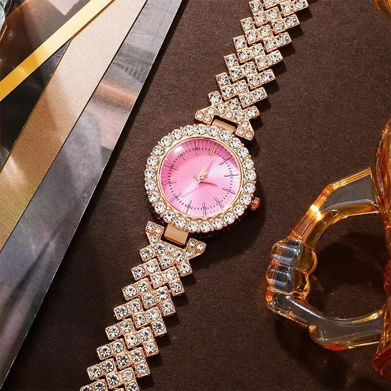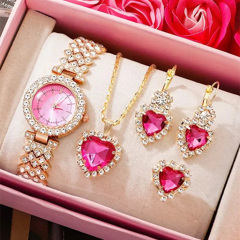 Gold Pink Luxury Watch Women Ring Necklace Earring Rhinestone Fashion Wristwatch Casual Ladies Bracelet Watches Jewelry Set