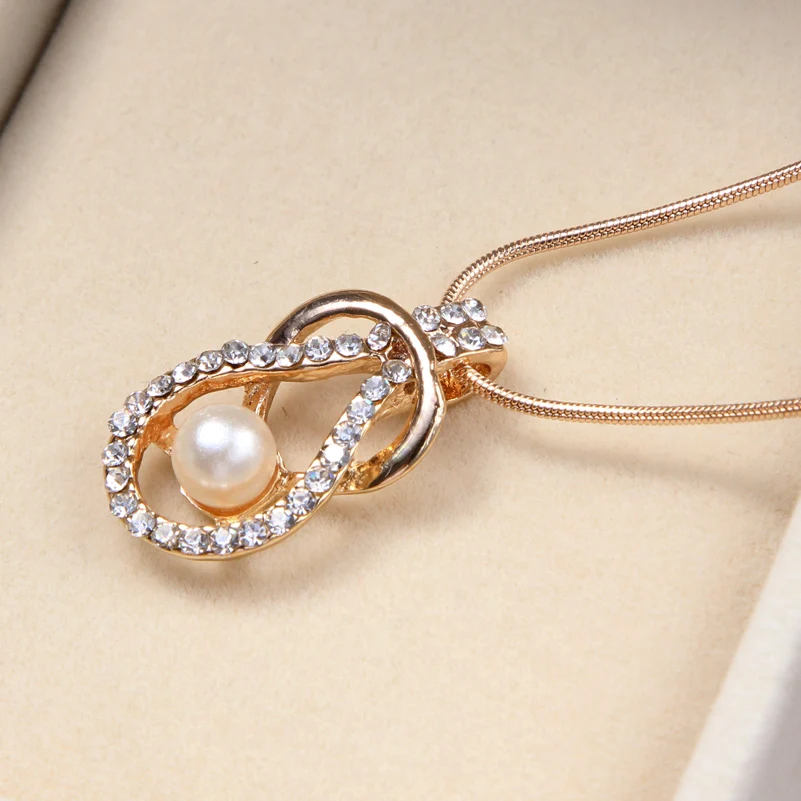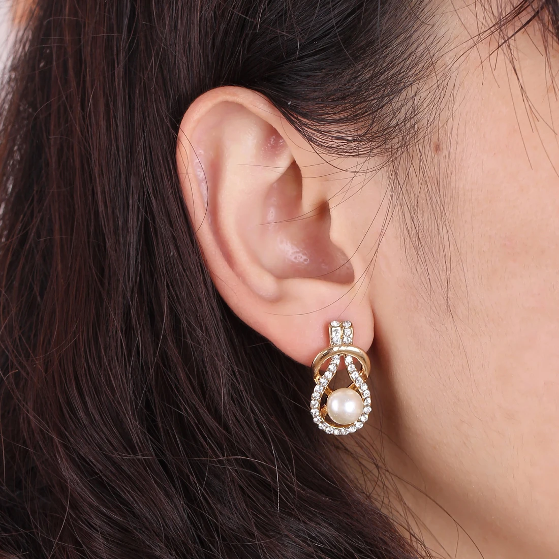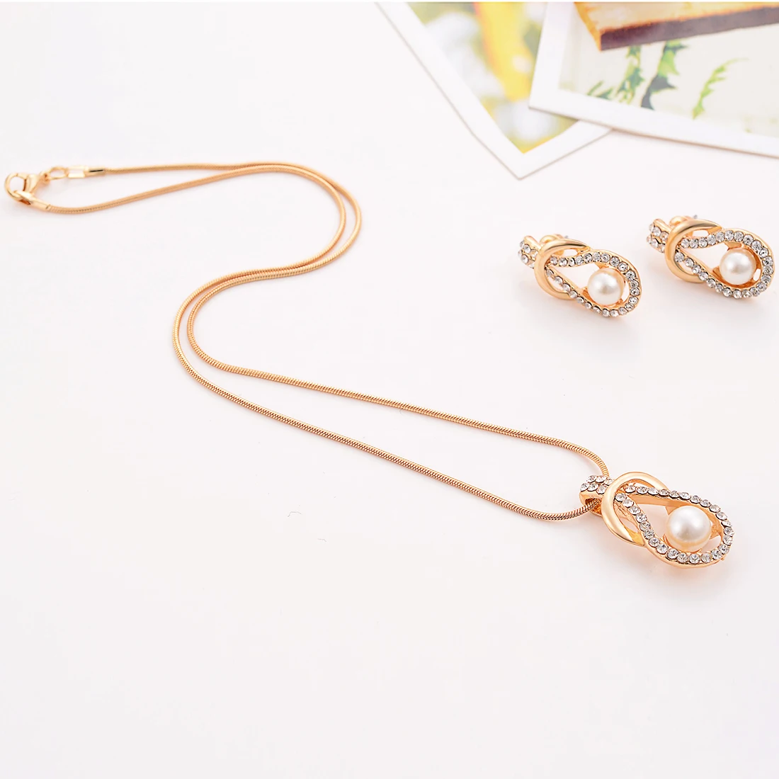 Gold Plate Color Simulated Pearl Jewelry Set Women Wedding Water Drop Crystal Earrings Pendant Necklace Set Snake Clavicle Chain