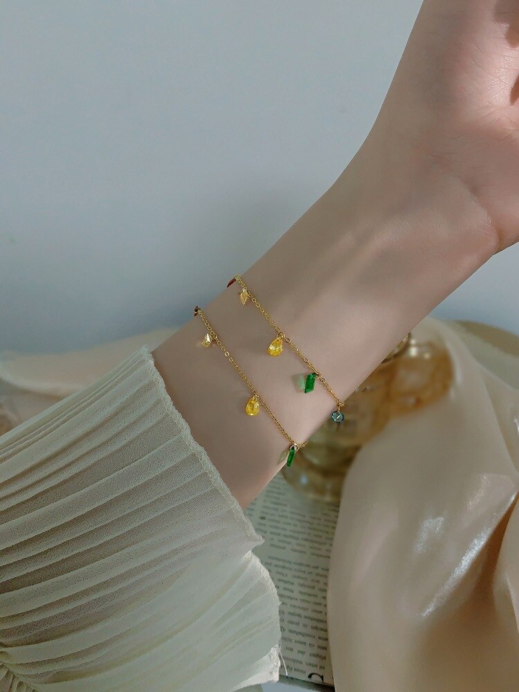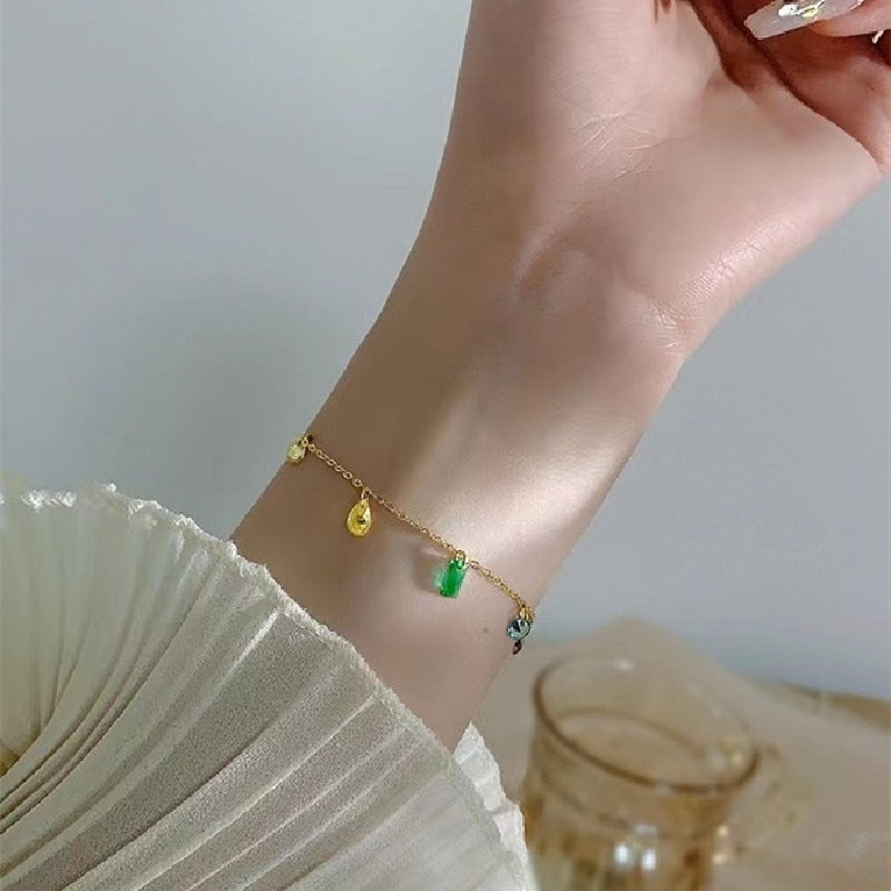 585 Gold Jewelry-316L Stainless Steel Gold Plated Bracelet Korean Simple Colorful Rhinestone Tassel Pendant Bangle For Women Girl Gift