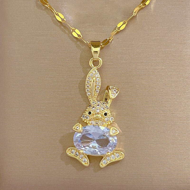 585 Gold Jewelry-316L Stainless Steel Gold Plated Clear Crystal Cute Animal Rabbit Charm Pendant Necklace For Women Girl Wedding Party Jewel
