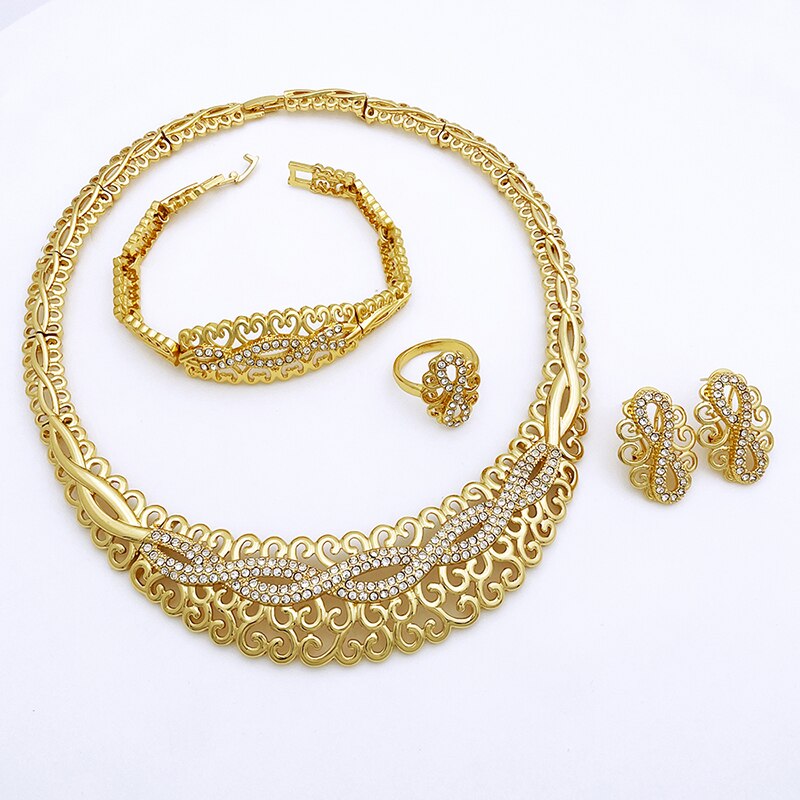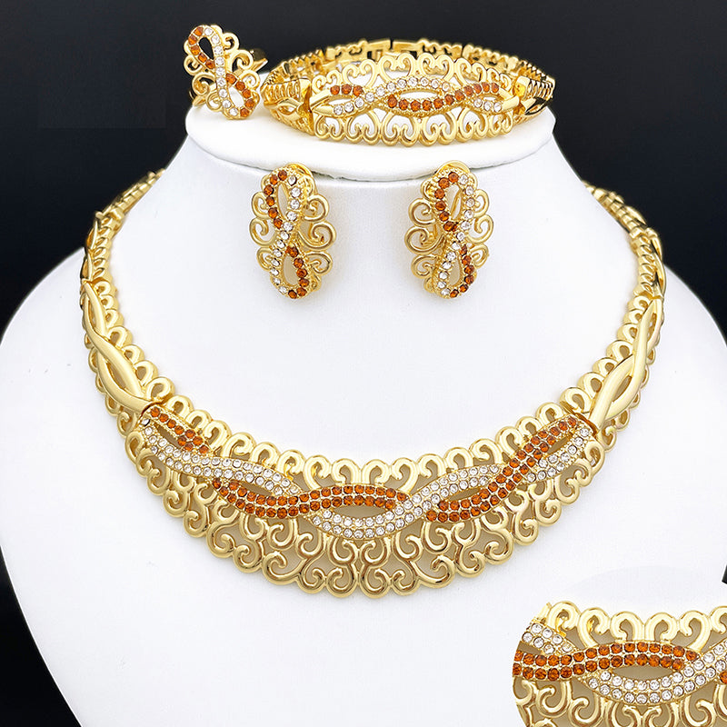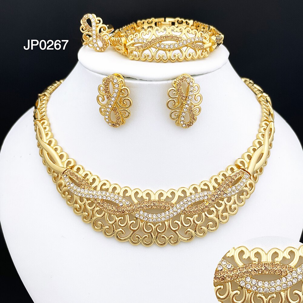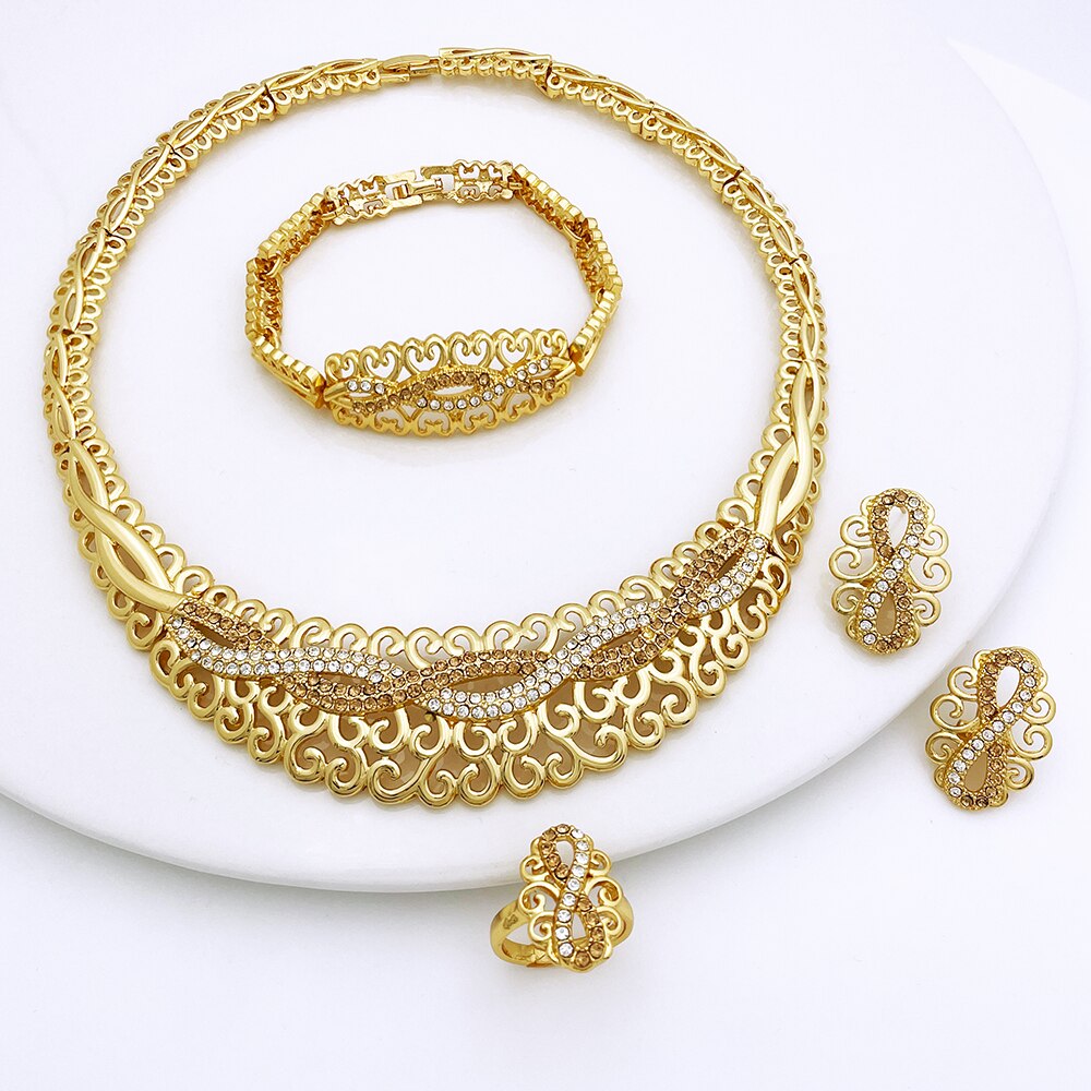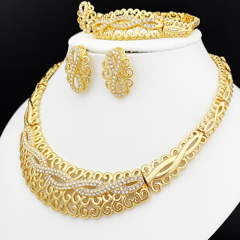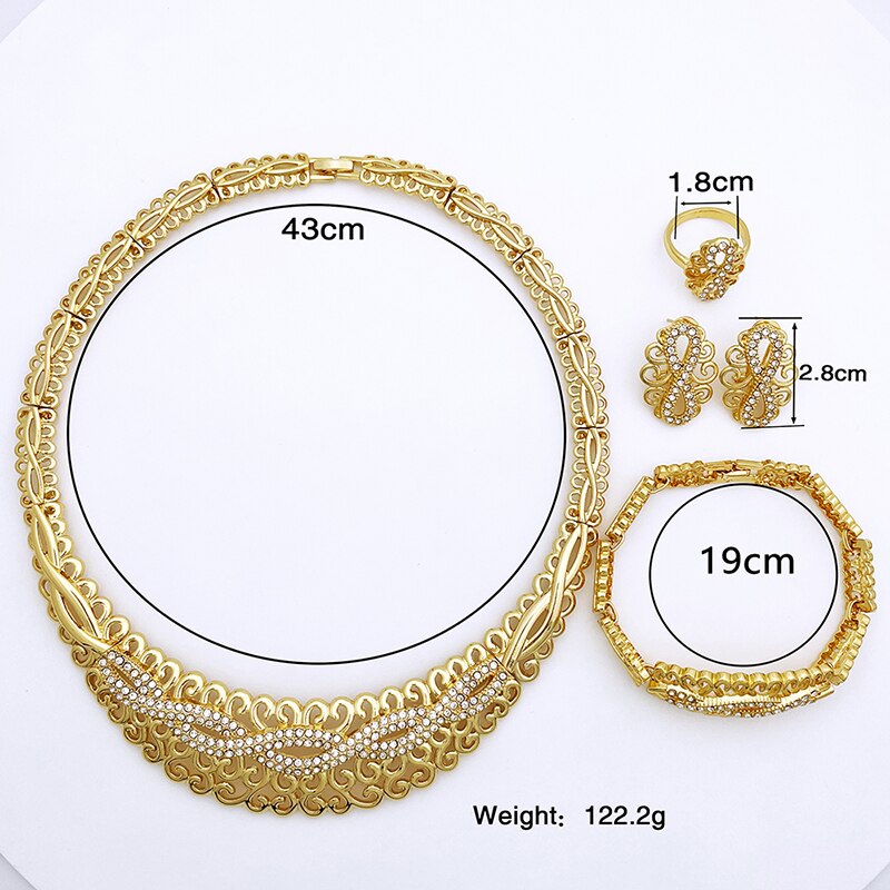 Newest Italian Gold Color Necklace Set Nigerian Bride Jewelry Luxury Colored Rhinestones Big Bracelet Women's Earrings