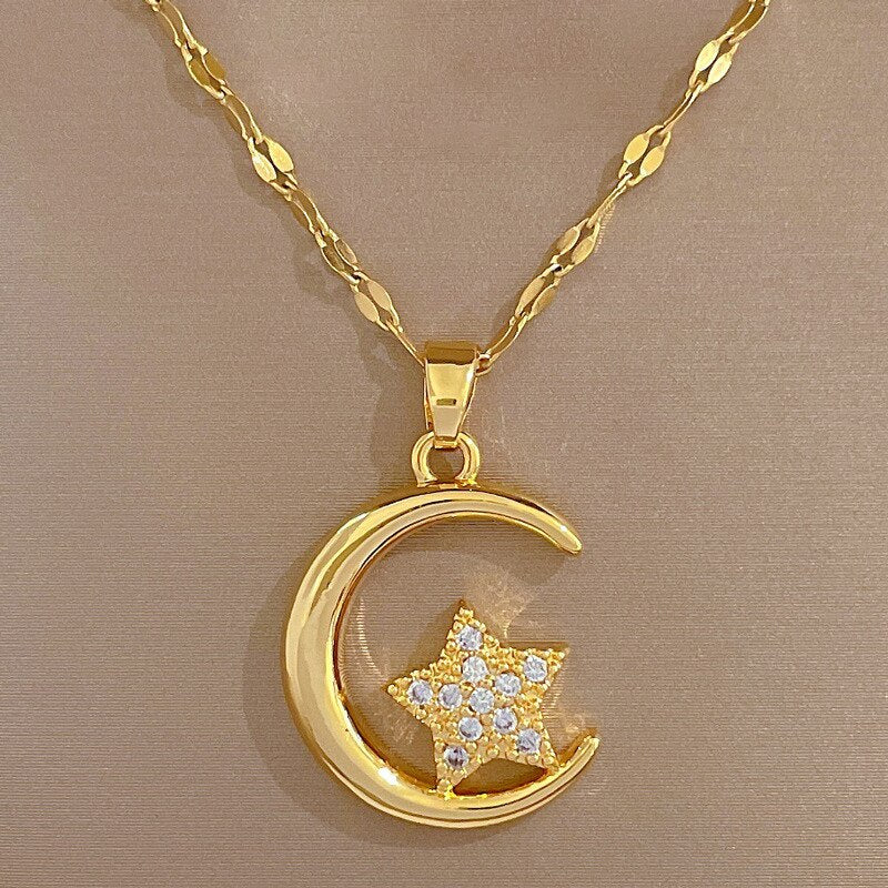 585 Gold Jewelry-316L Stainless Steel Gold Plated New Trendy Zircon Star Moon Pendant Necklace For Women Sexy Clavicle Chain Jewelry