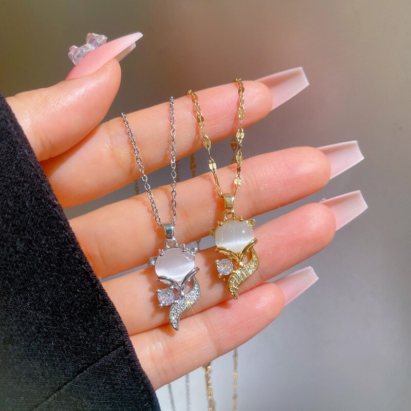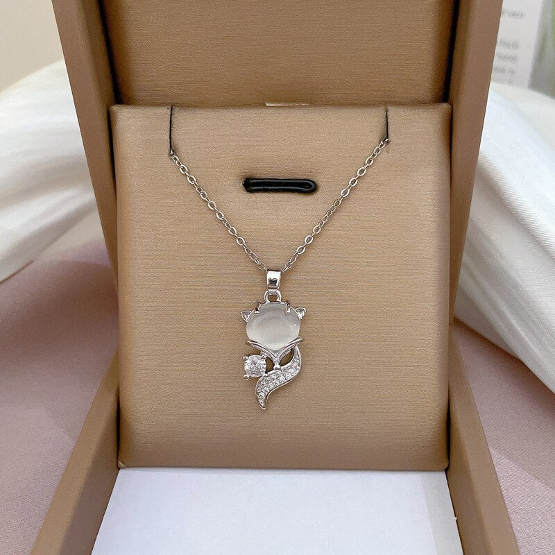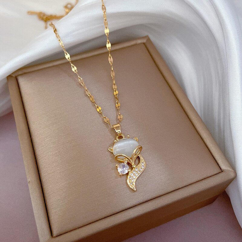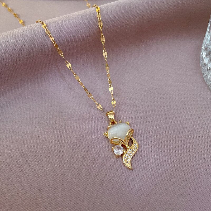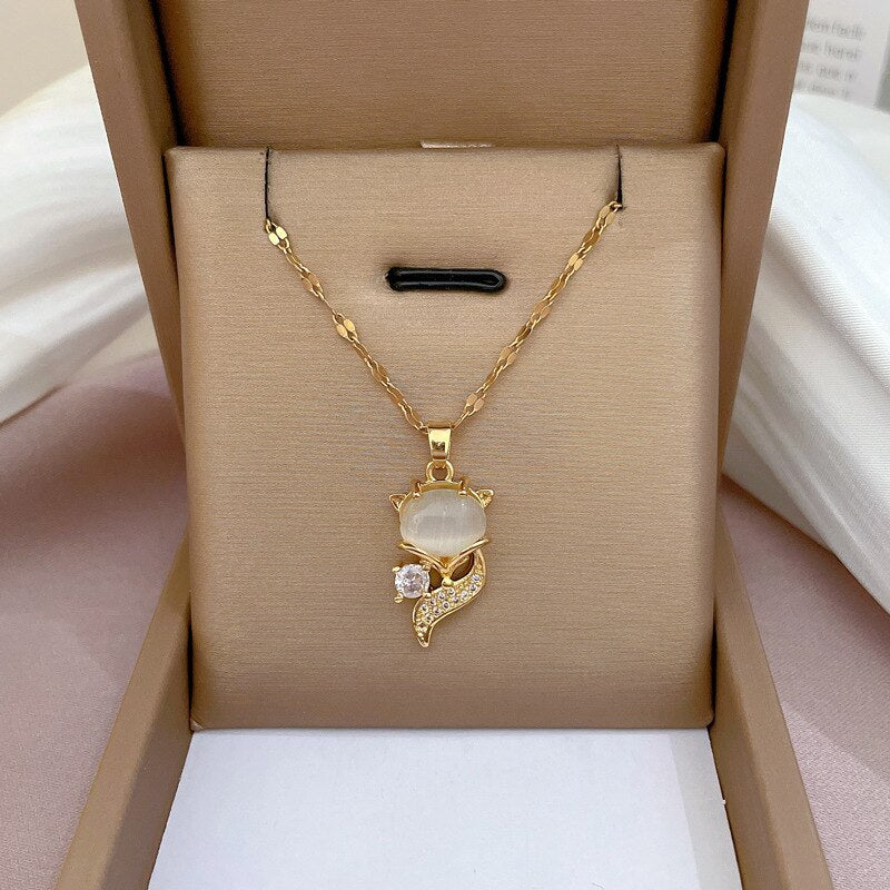 585 Gold Jewelry-316L Stainless Steel Gold Plated Opal Cute Fox Necklace For Women Sweet Romantic Trendy Chain Choker Girls Jewelry Gift