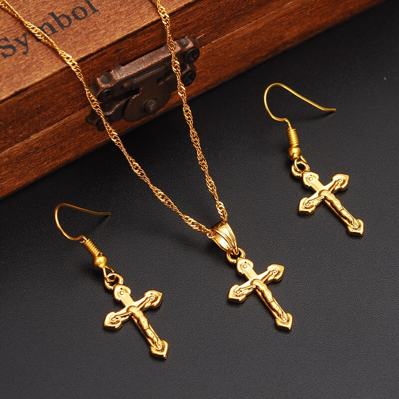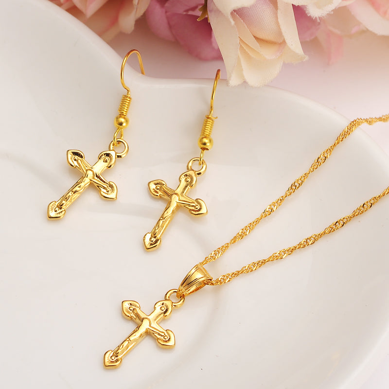 Afraic Jewelry-gold small cross Pendant Necklace chain Earrings sets Jewelry Gold Christian jewelry sets for women girl Best Jesus Gifts