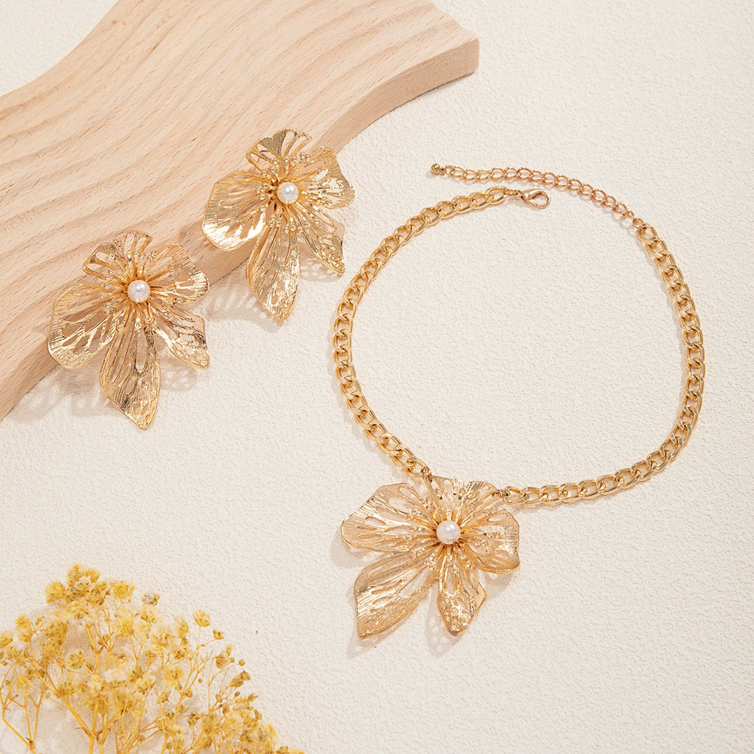 Goth Big Flower Pendant Choker Necklace for Women Elegant Imitation Pearl Piercing Stud Earrings Grunge Jewelry Set Steampunk