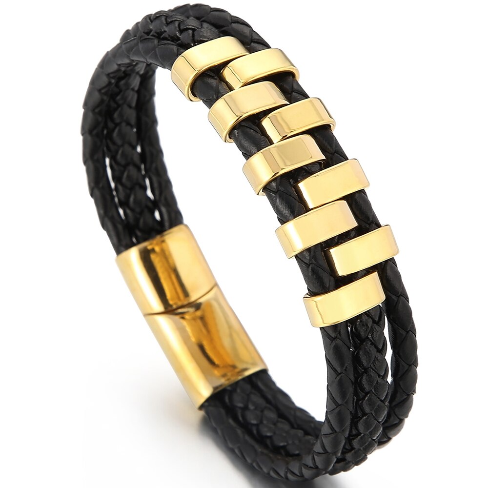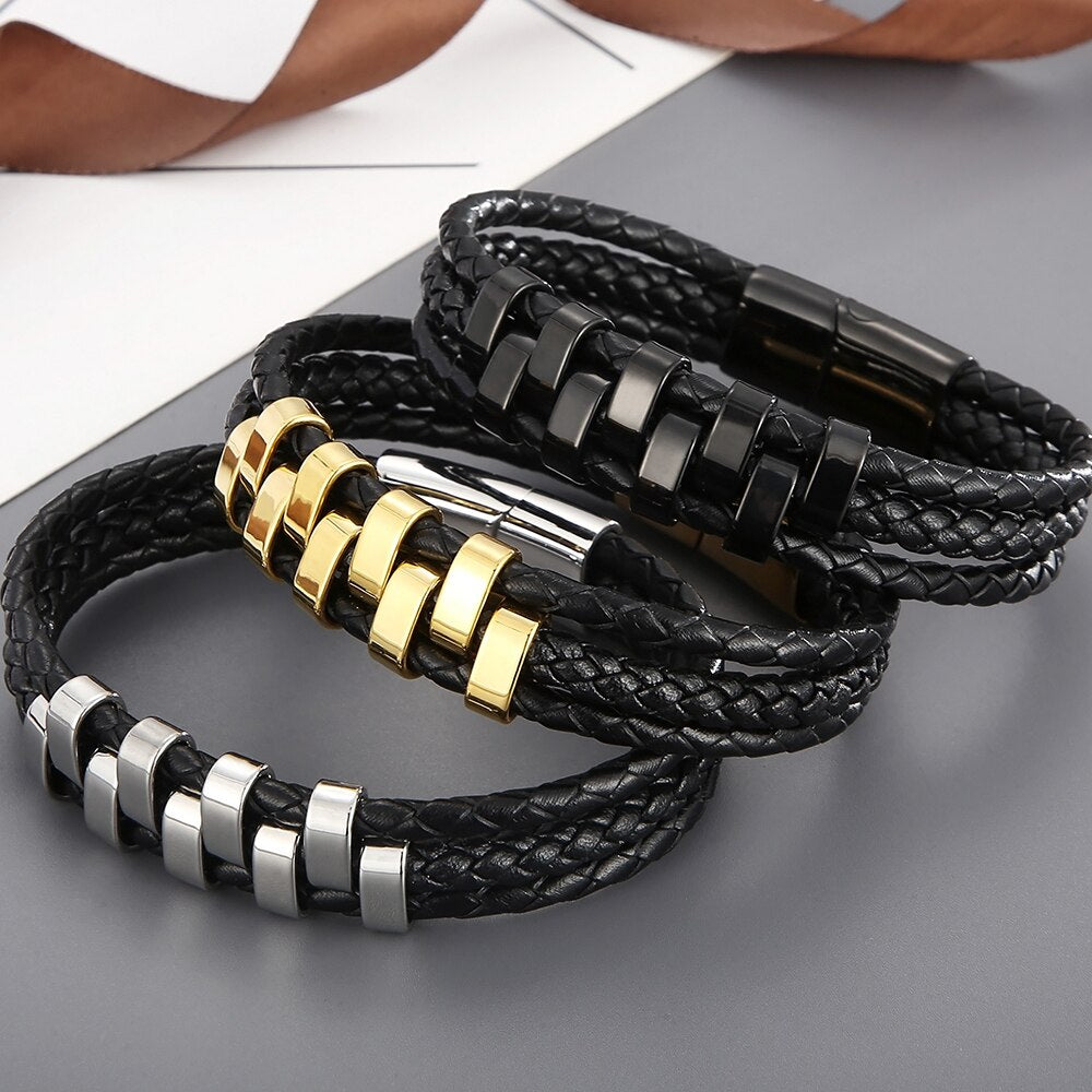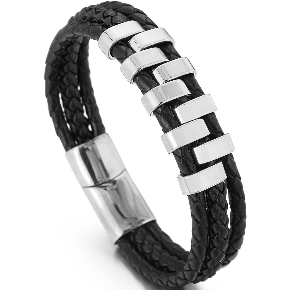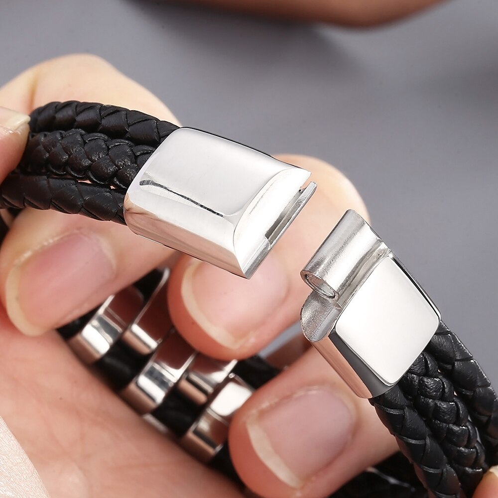 Handmade Three Layer Leather Bracelet for Men In 316L Stainless Steel Men's Wrist Bracelets With Magnet Clasp Male Hand Jewelry