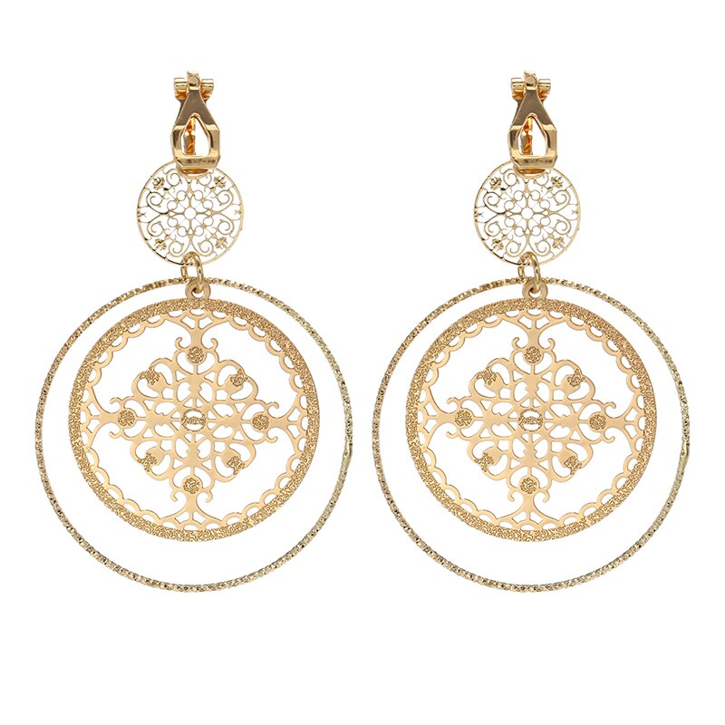 Fashion Earrings- Hollowed Dsic Textured Round Clip on Earrings No Piercing Gold Color Big Circle Hoop Ear Clips for Women Girl Party Gift Jewelry