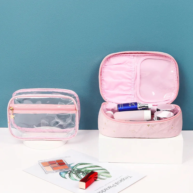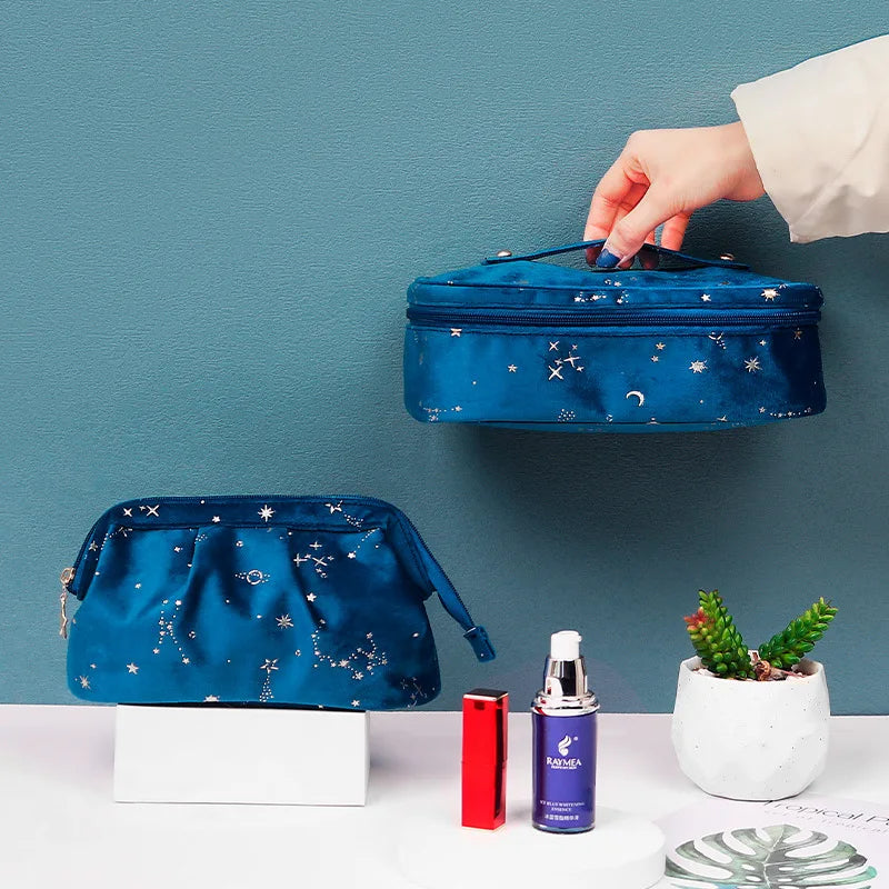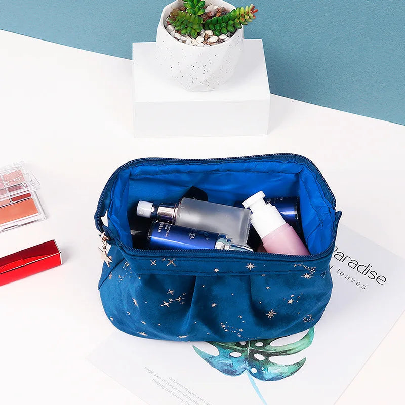 Hot Gold Star Moon Flannel Cosmetic Bags Portable Large Capacity Velvet Make Up Storage New Fashion Wet Dry Separation Wash Bag