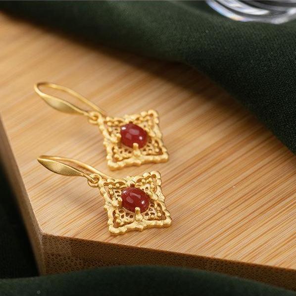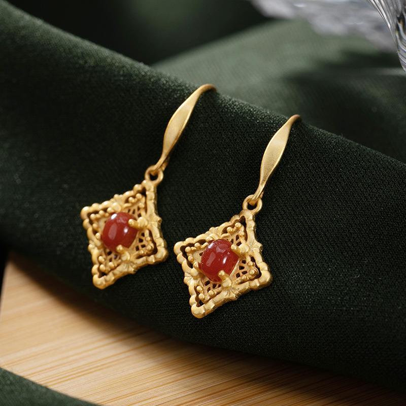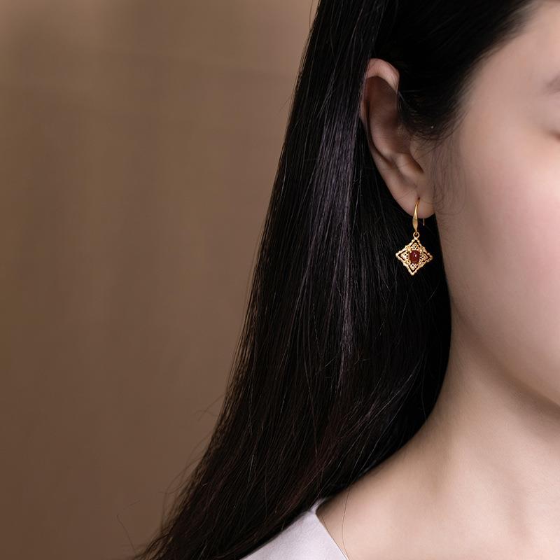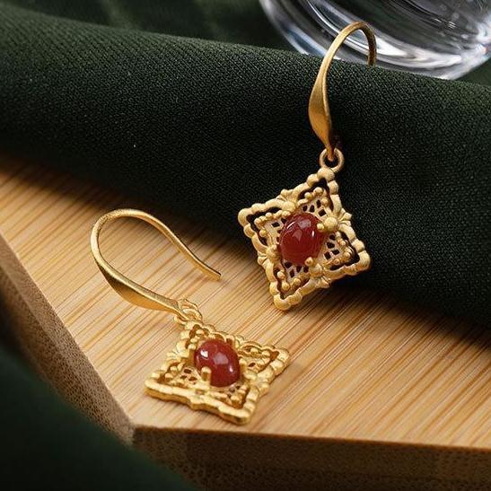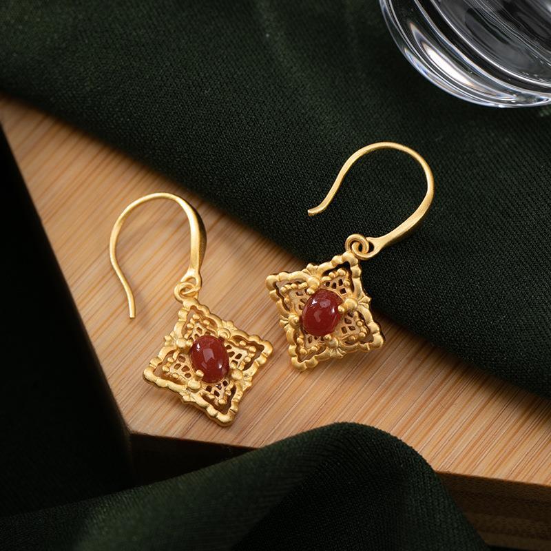 Drop Earrings-Independent design ancient gold craftsmanship south red tourmaline square earrings exquisite and elegant ladies silver jewelry