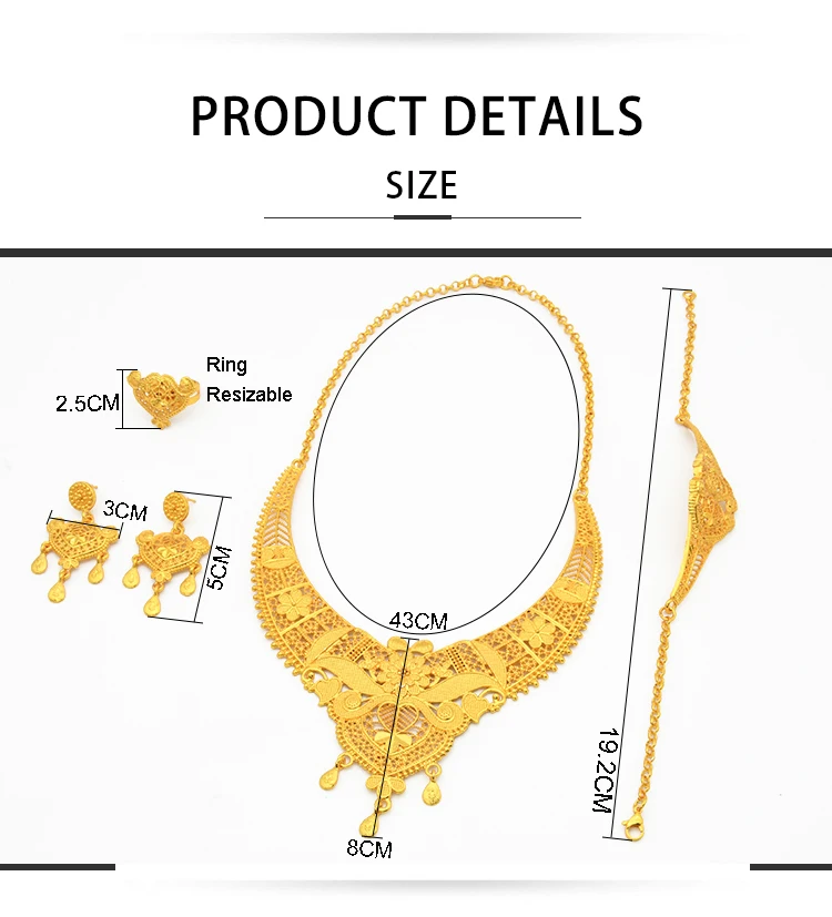 (1) Necklace approx :43cm +5cm. Bracelet approx :19.2cm .One set includes 1 Necklace,1 Bracelet,a pair of Stud Earrings and a Ring.