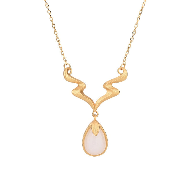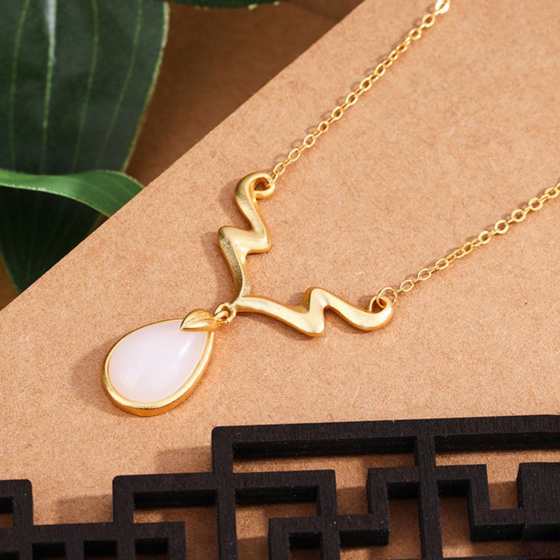 Chains Necklaces-Inspired Ancient Gold Craft Inlaid Natural Hotan White Jade antler Necklace water-drop Pendant Court style Jewelry for Women