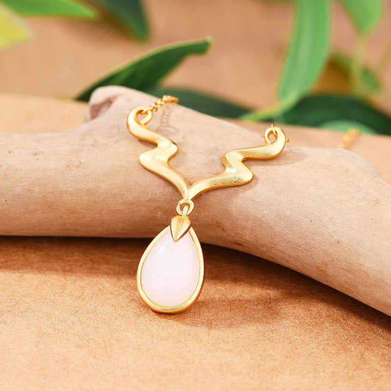 Inspired Ancient Gold Craft Inlaid Natural Hotan White Jade antler Necklace