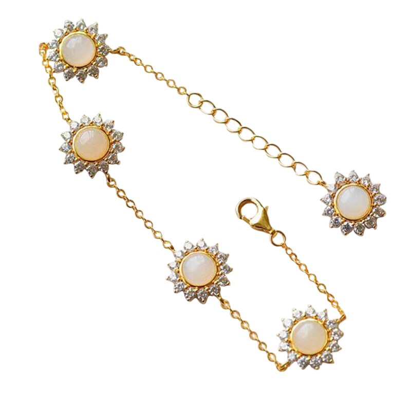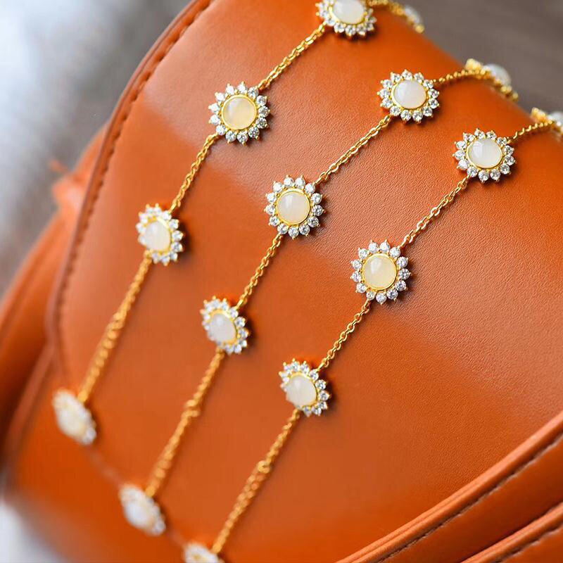 Inspired design silver inlaid natural Hetian chalcedony daisy sun flower bracelet