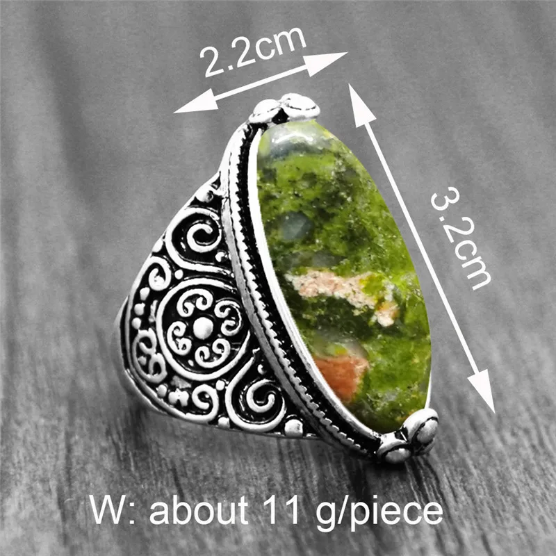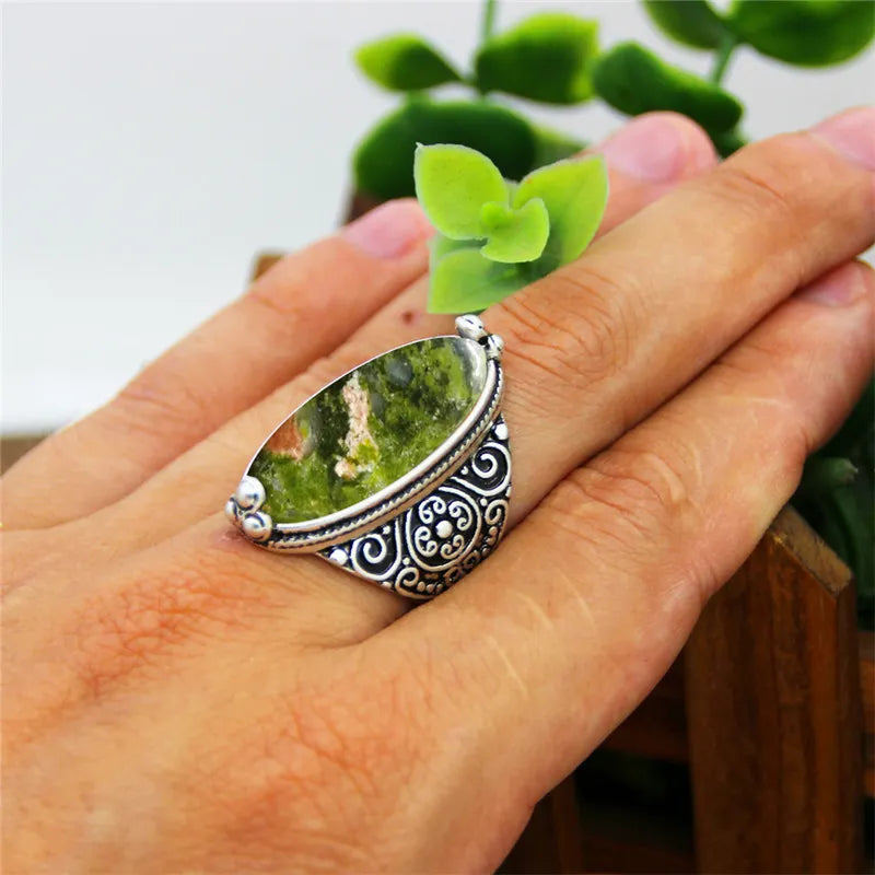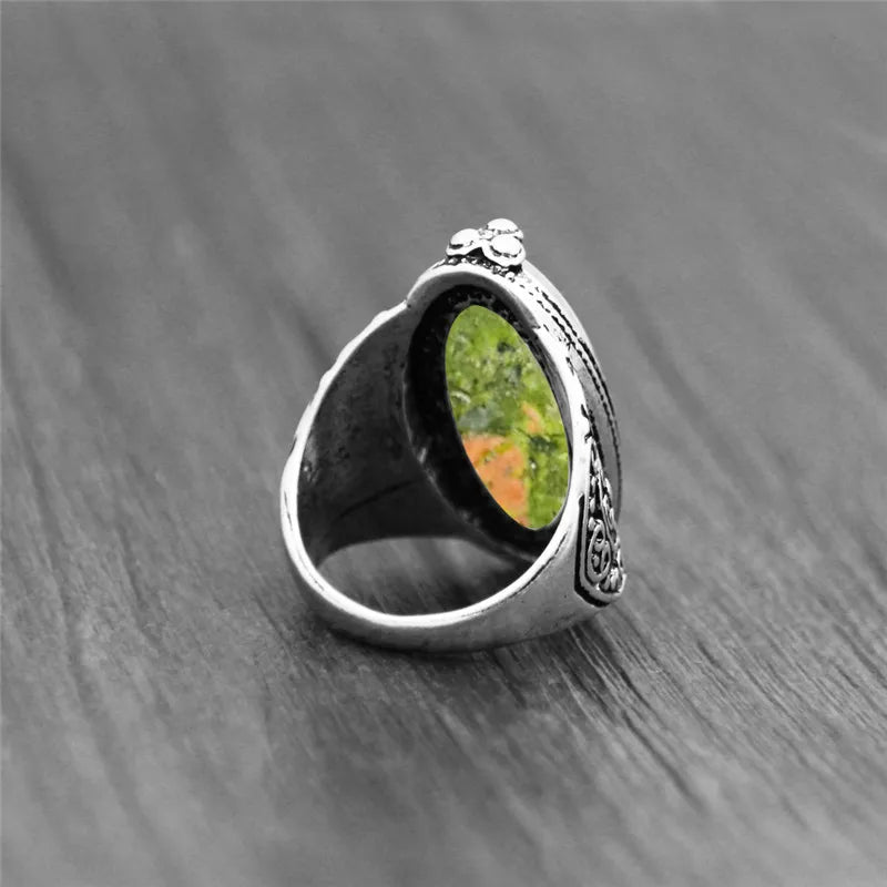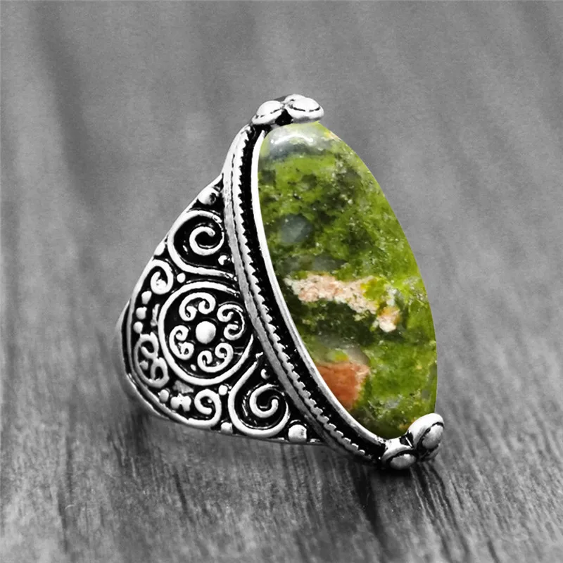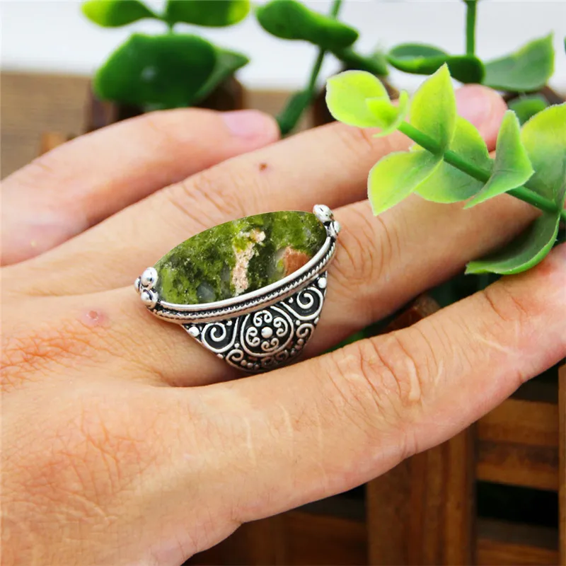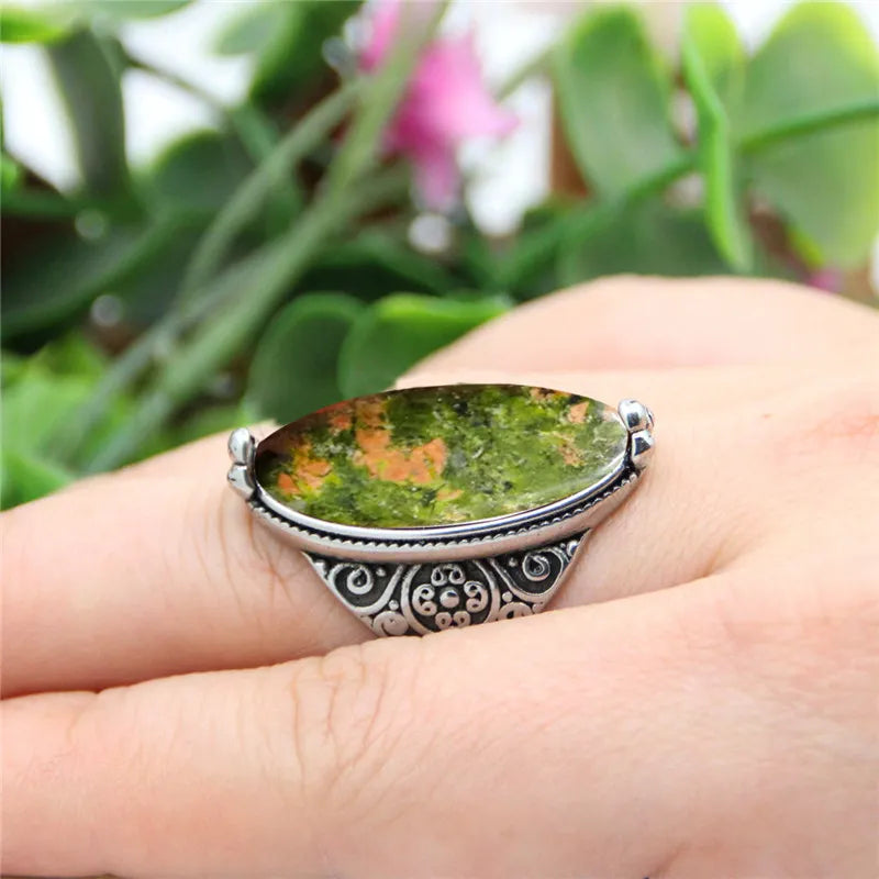 Vintage Jewelry-Irregular Eye Shape Unakite Rings Flower Band Natural Stone Antique Silver Plated Fashion Ring
