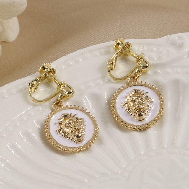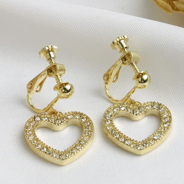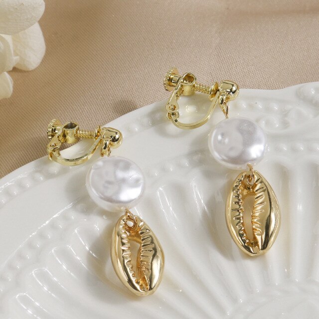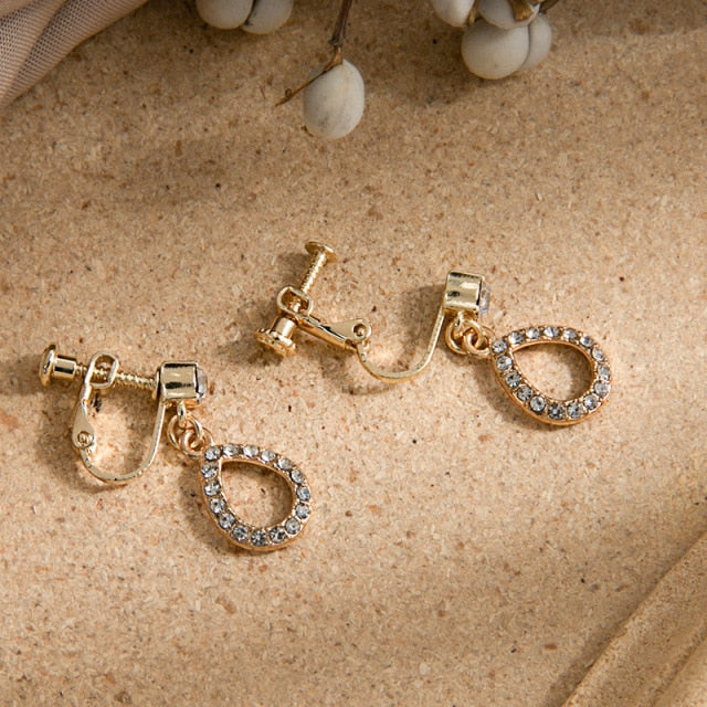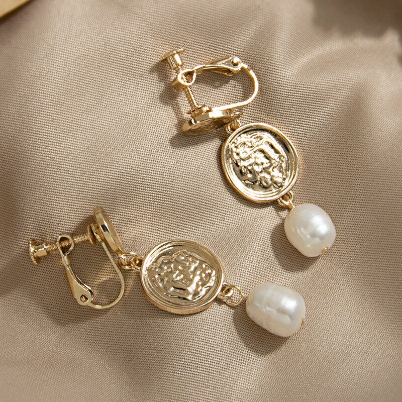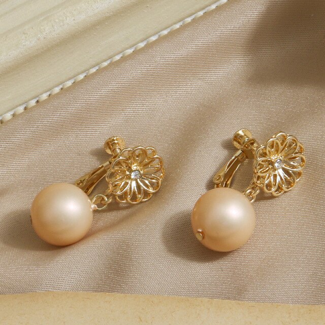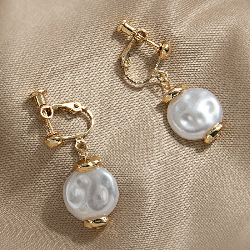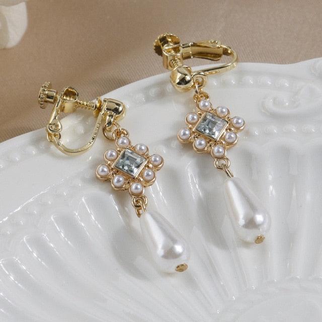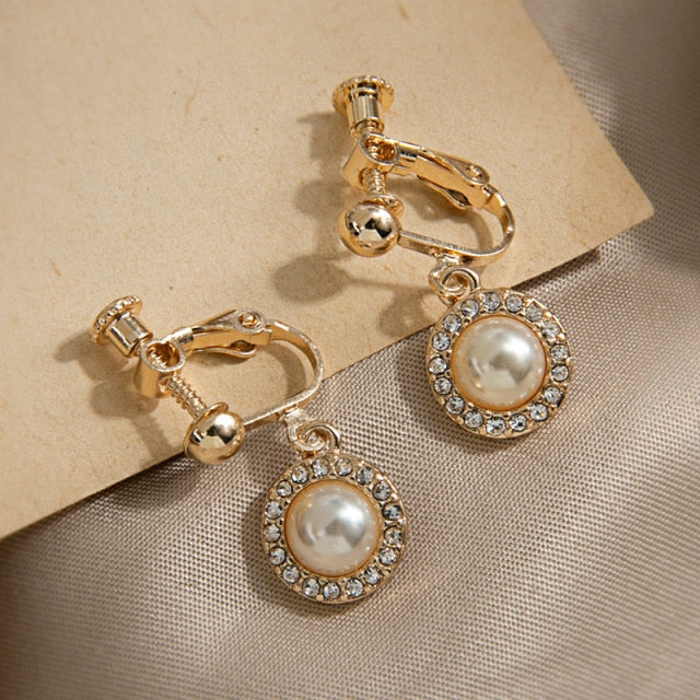 Fashion Earrings- Korean Design Simulated Pearl Screw Clip on Earrings Non Pierced Baroque Rhinestone Ear Clip