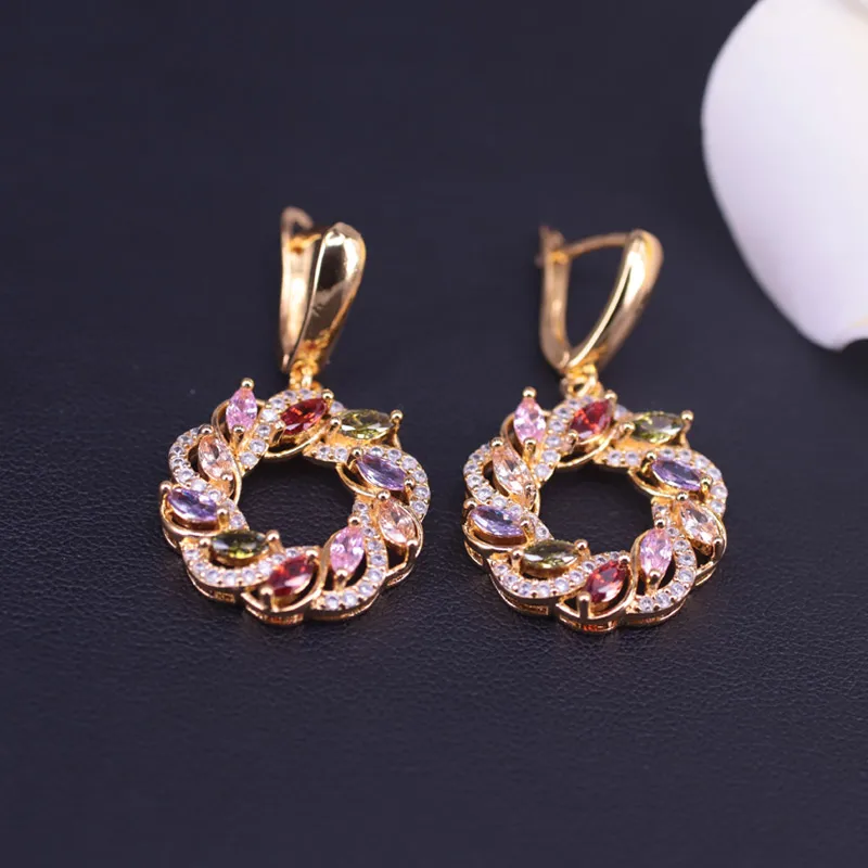Lucky Round Circle Colorful Top Zircon Gold Color Costume Jewelry Set Necklace Earrings Set With Pendant